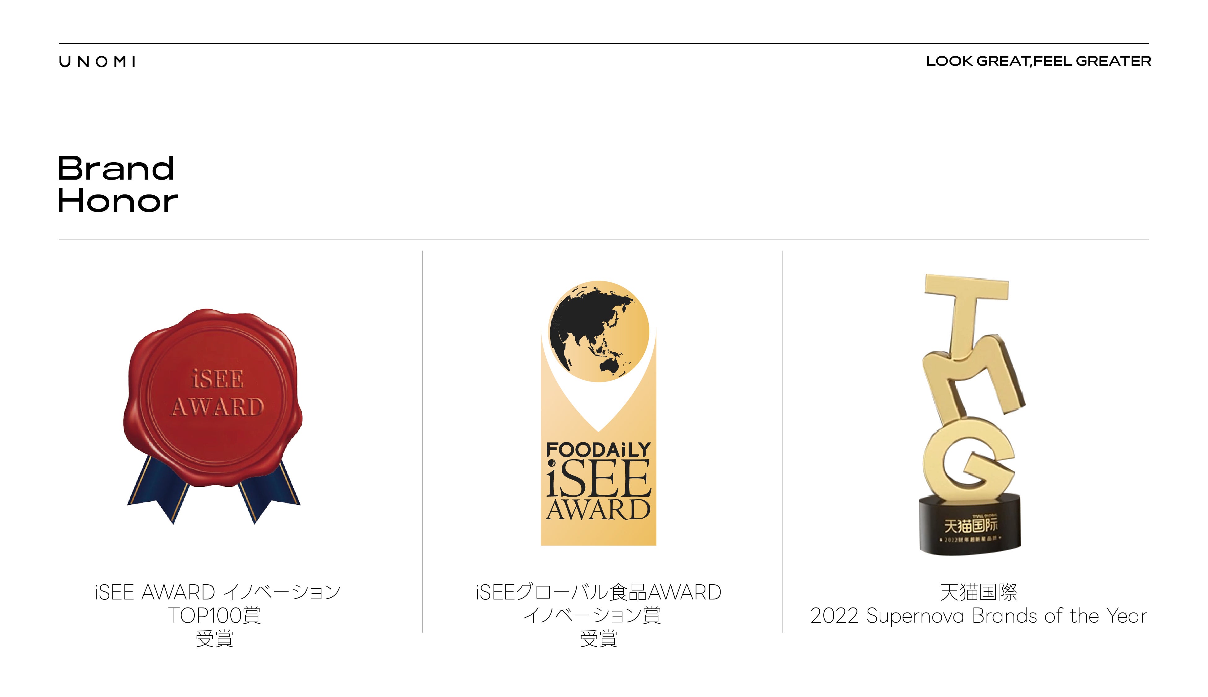 私たち「UNOMI」のサプリメントは、日本で製造されています。そしてすでに2021年から、お隣りの中国のような一部の国際市場で先行発売されています。今まで非常に沢山の海外の消費者の方に、ご購入いただきました。中国の最大のECモール「天猫」では、同カテゴリー年間販売ランキング1位となりました!!海外での大成功を踏まえて2024年の今年は、製造国である日本の皆様にも「UNOMI」のサプリメントをぜひご体感頂きたいと考え、本プロジェクトを立ち上げるに至りました。