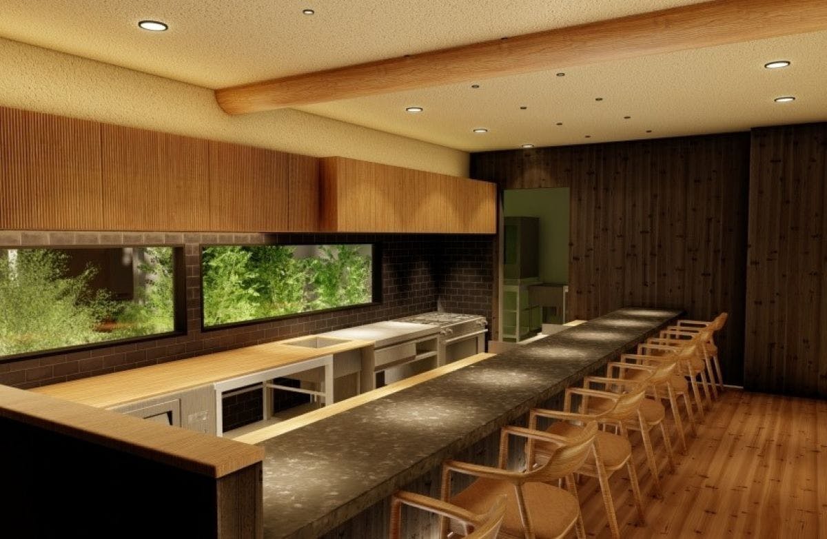 大きな松や紅葉、桜に囲まれた邸宅は、一度足を踏み入れると故郷に帰ってきたような懐かしさと温かさが感じられ、また建物がつくられた時代にタイムスリップしたかのような感覚にもなります。店内のうち、文化財エリアには“和”を基調とした半個室2部屋と個室1部屋の計3部屋を、古民家エリアには中庭の景色とライブキッチンを愉しみながらゆったり寛げるカウンター席を7席ご用意いたします。