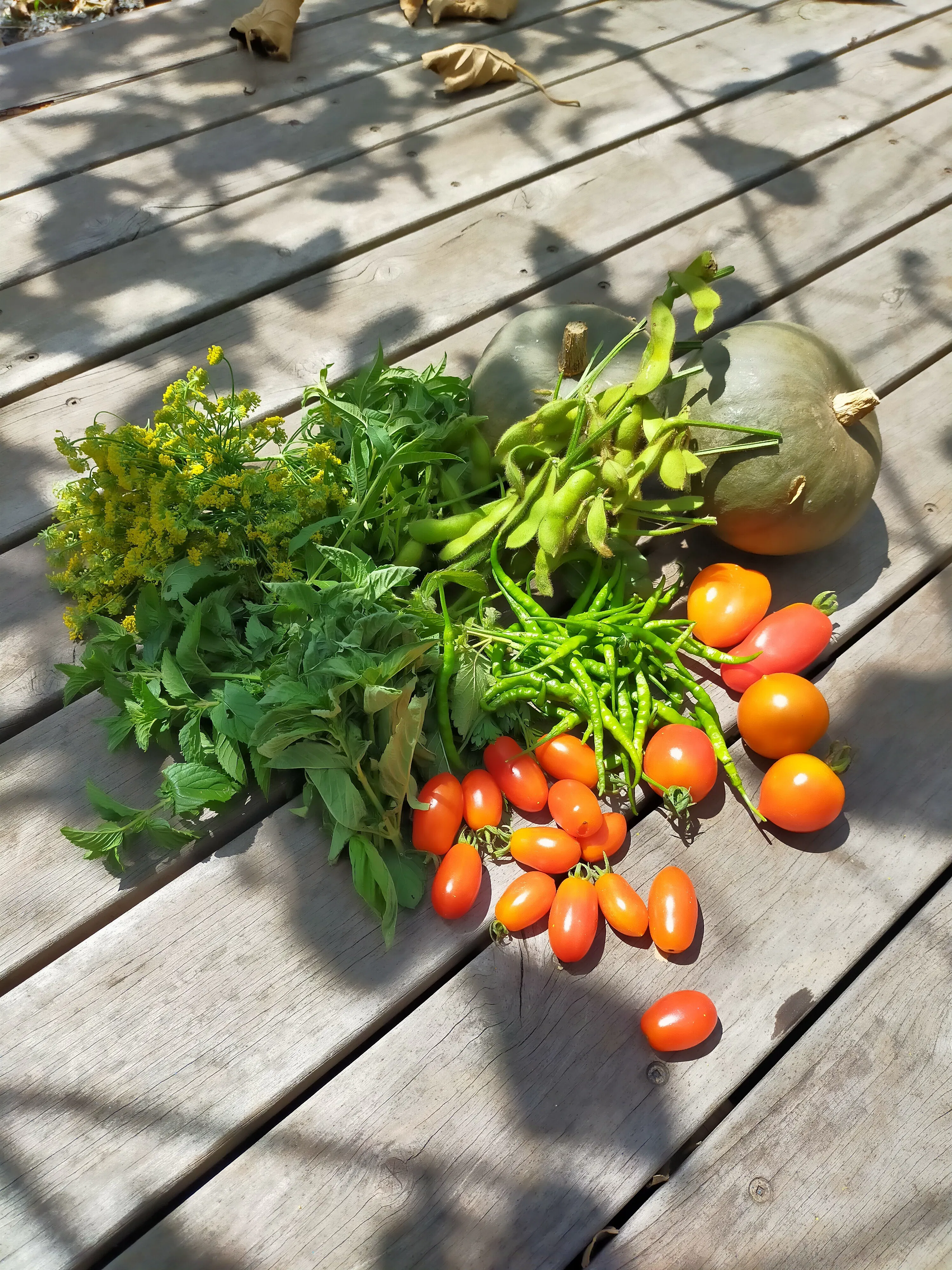 東京南瓜、スズノ大豆(枝豆)ヒモトウガラシ、トマト、ハーブなど炎天下続きでも野菜たちは頑張って大きくなっています。