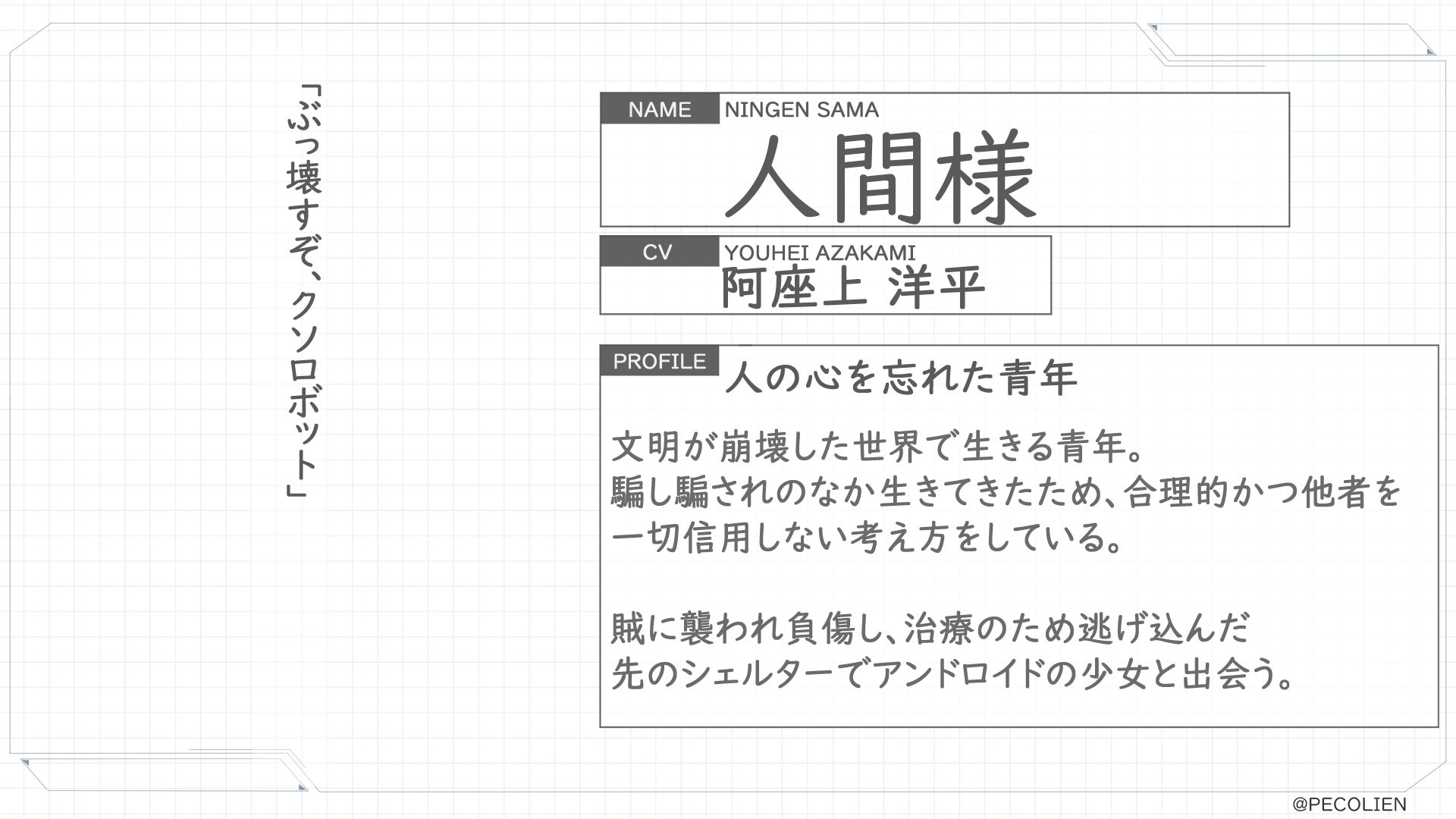 このプロジェクトの始まりは「ロボットみたいな人間と人間みたいなロボットの対話による成長物語」を書いてほしいと「白雪 玄」に頼んだことからでした。そこから、自分の想像を超える大勢の方に協力していただきゲーム制作させていただいています。