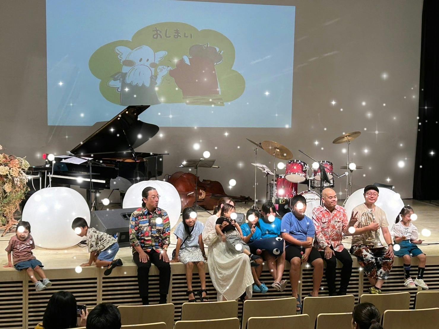 2023/08/29 09:24KidsJazz百本マイです。みなさまに暖かくご支援をいただきましたおかげで、昨日無事にKidsJazzバリアフリー音楽絵本コンサートを開催することができました。子どもたちの目の前で繰り広げられる生演奏や即興のリズム遊びに、来場の子どもたちもノリノリ♪楽器でおしゃべりコーナー では子どもたちの好きな食べ物やパパさんの好きな動物を楽器で表現してもらったり、8月9月お誕生日の来場の皆さんに「Happy Birthday」の曲に合わせてみんなで歌ったり♪このコンサートに向けて書き下ろした民話のアレンジ物語『カミナリさまがおっこちた』は、カミナリと村人たちとの掛け合いをドラムと管楽器、カミナリさまのいびきをコントラバスで。生演奏ならではの演出とスクリーンの絵、物語の展開に子どもたちも引き込まれて見入ってくれました。カミナリさまにも負けない?電気ナマズを持って会場を練り歩き。演者が客席まで「ビリビリするかな?ビリビリしないか?ギリギリどっちかな?」とふれあう場面には子どもたちも大興奮♪終演後のふれあいタイムでも近くで楽器に触れに来てくれる子、KidsJazzのオリジナル絵本にサインとメッセージを書かせてもらったり。みなさまのおかげで、子どもたちとの距離がとても近いコンサートを開催することができました。昨日から始業式という学校も多い中、みなさまのご支援のおかげでたくさんんの子どもたち、パパさんママさんにこのコンサートをお届けすることができました。本当にありがとうございました! もっと見る