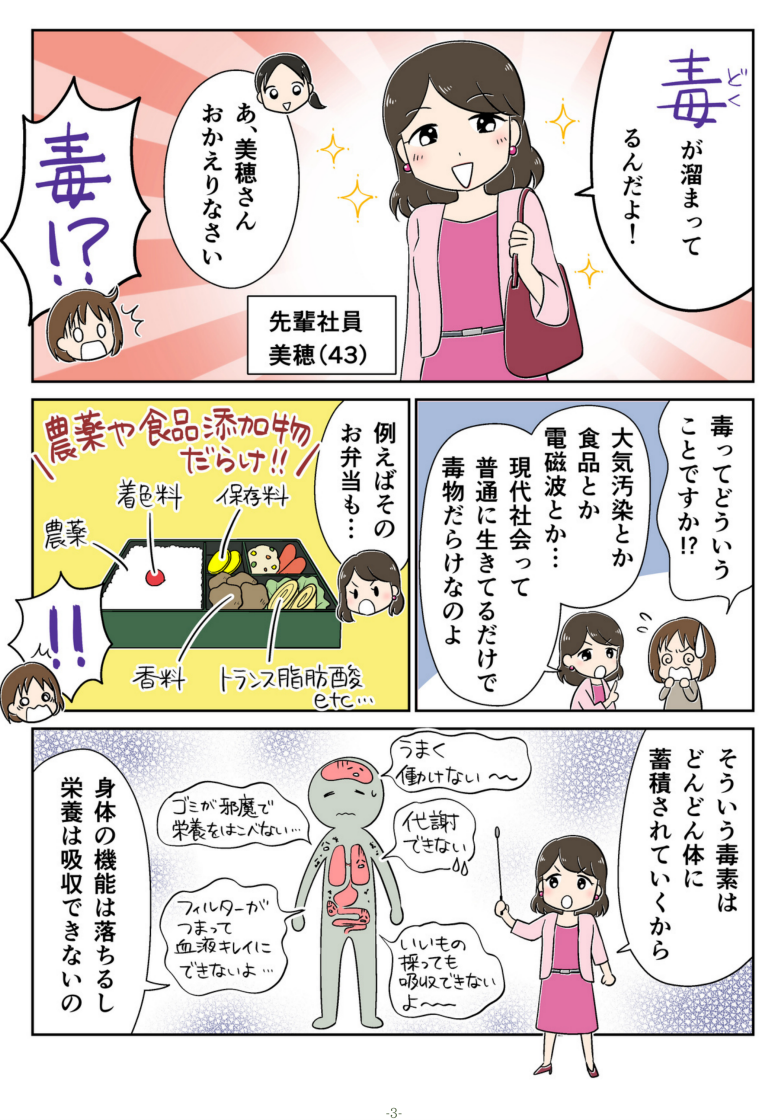 現代の日本では、どこにでもあるコンビニの食品には、トランス脂肪酸や食品添加物、残留農薬などが含まれています。食べ物だけでなく、医薬品や化粧品、シャンプー、制汗スプレー、洗濯用洗剤など、身の回りの多くのものが有害物質を含んでいます。そのような時代に生きる私たちにとって、毒を避けるのは簡単ではありません。