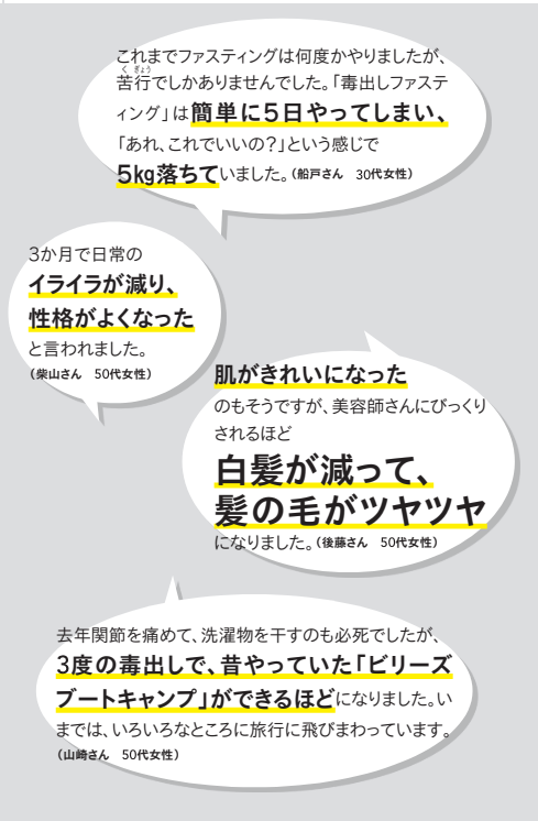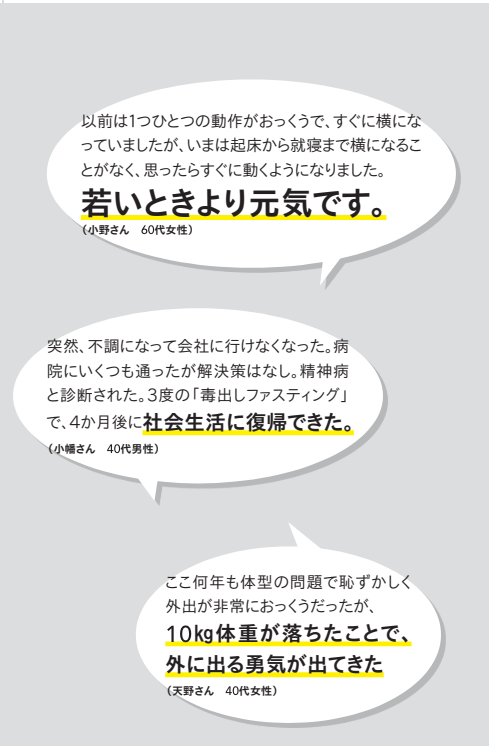 1,800人以上の方がこの本に書かれている事を実践されており、「体が軽くなった」「肌が綺麗になった」「気分が晴れやかになった」など嬉しい感想がたくさん届いていますので、その一部をご紹介させていただきます。