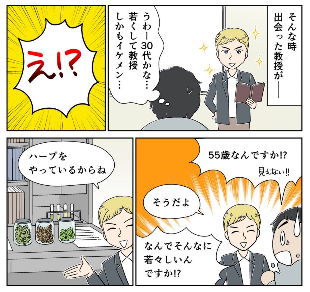 フランス留学時代にハーブの可能性に気づけたのは、指導教官のおかげでした。彼は当時55歳でどちらかと言えば定年に近い存在でしたが、見た目は20歳以上、若かったので。どう見ても30代にしか見えない。
