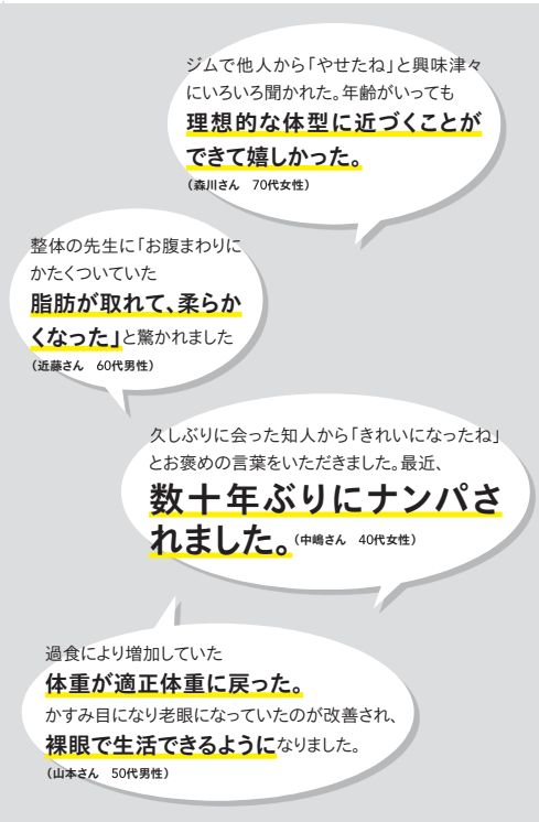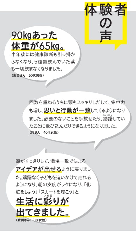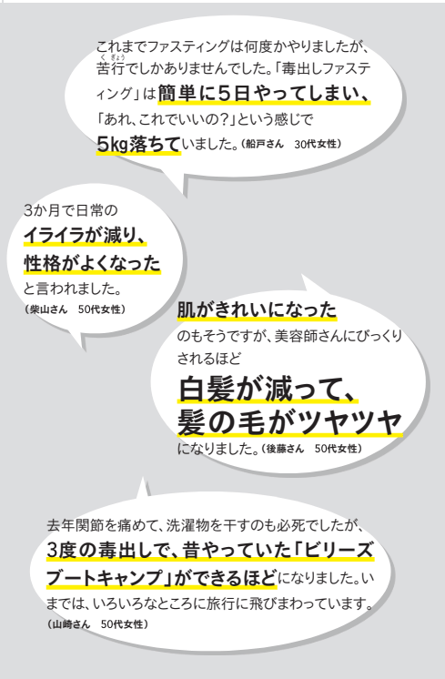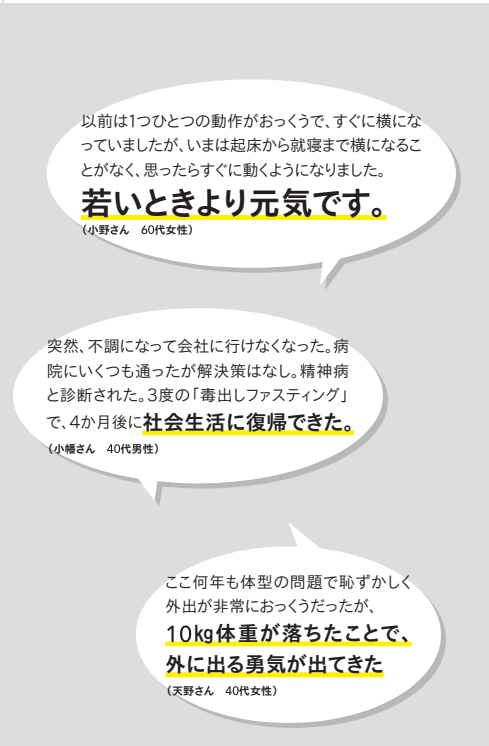 1,800人以上の方がこの本に書かれている事を実践されており、「体が軽くなった」「肌が綺麗になった」「気分が晴れやかになった」など嬉しい感想がたくさん届いていますので、その一部をご紹介させていただきます。