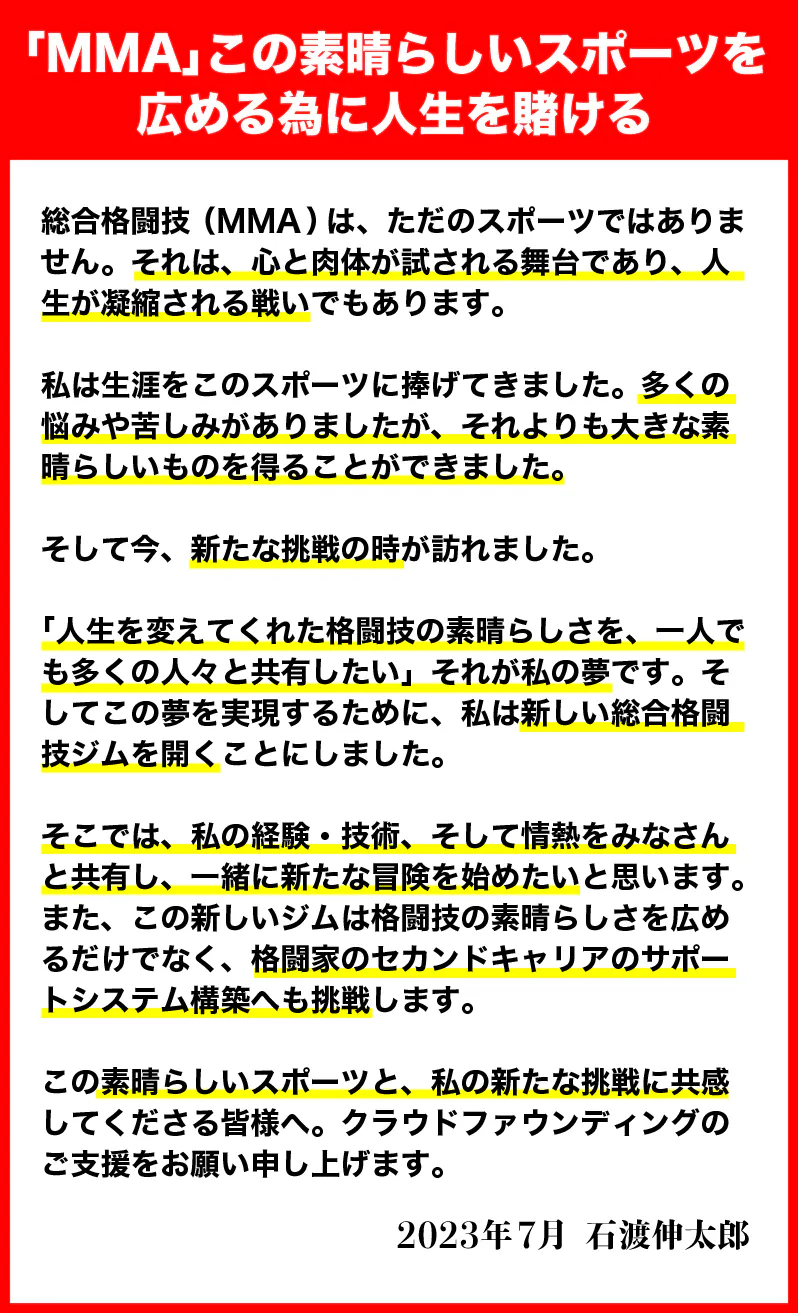 これから綴る私の想いを読んでいただき、格闘技の可能性を信じ、私たちと一緒に新たな未来を作り出すことにご協力いただけると幸いです。