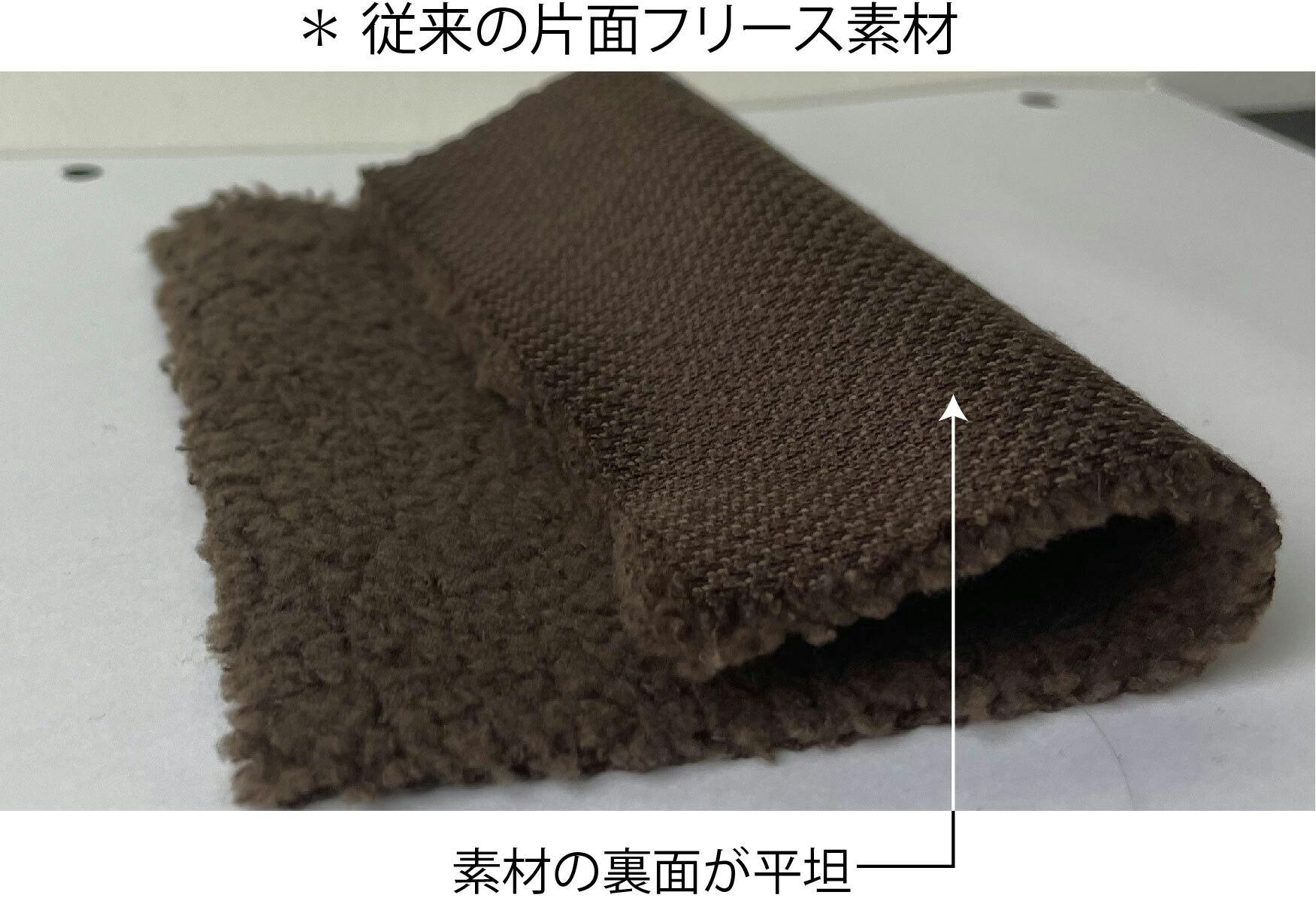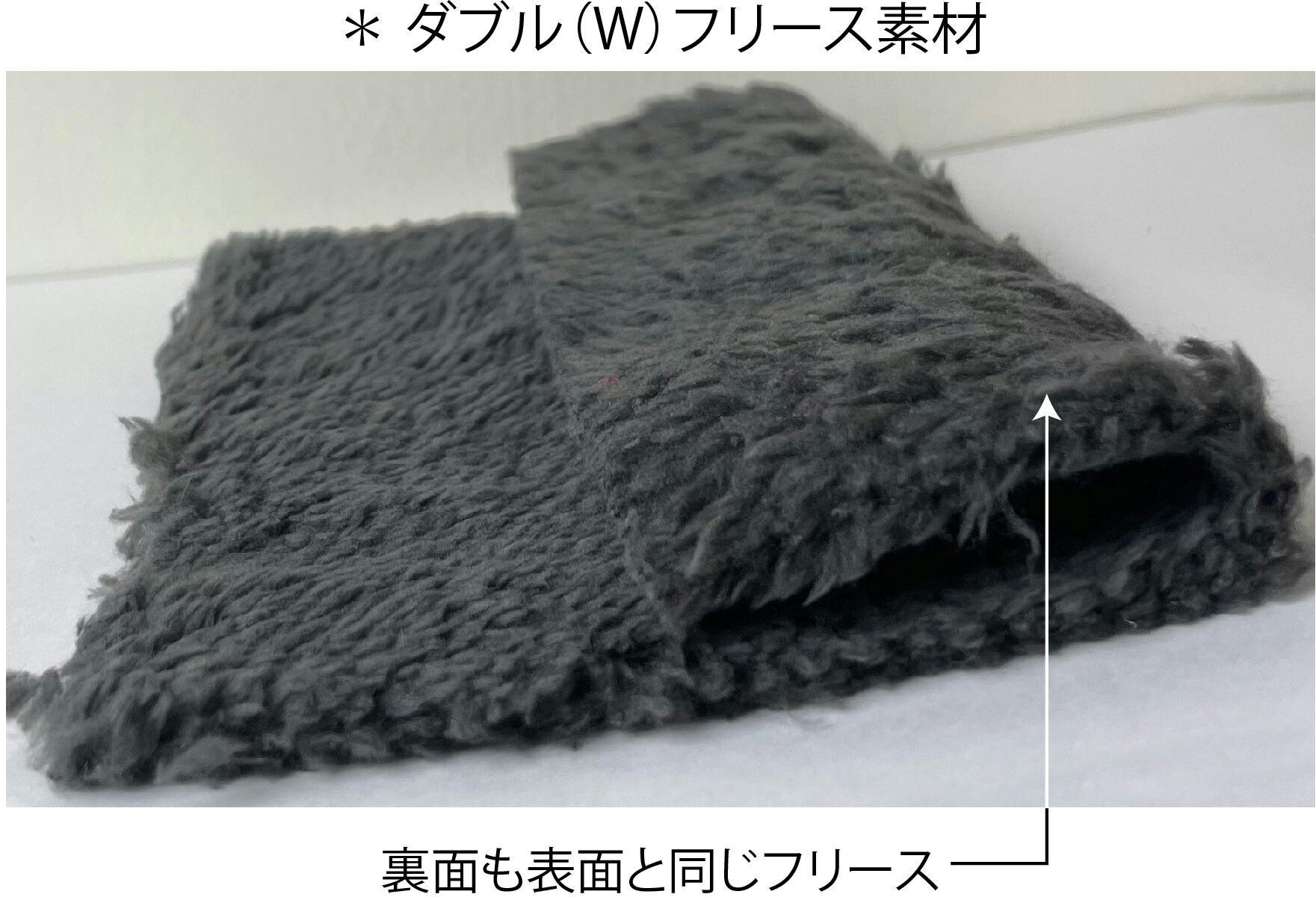 なぜ片面フリースでなくダブルフリースにする必要があるのかについて説明します。フリースの基盤は植毛をするために網状の強化形状になっていて、その網に植毛をするので基盤面つまりフリースの裏側は硬さを感じます。そこで今回のプロジェクトに使用いたしました両面ダブルフェースであればハリ感もなくボリュウム感とさらに暖かさが倍増するために採用しました。