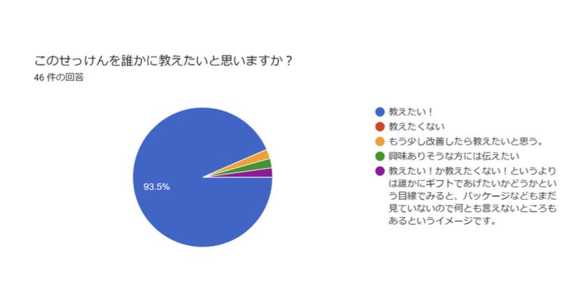 『このせっけんを誰かに教えたいと思いますか』の質問では93.5%の方が『教えたい!』とのご回答、嬉しいかぎりです!