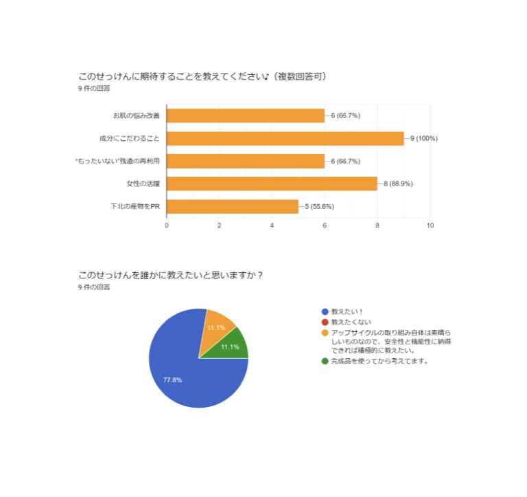 2種類の石鹸の試作を行い、約50件のモニターさんから使用感などのアンケートにご協力いただき、改善点が明確になりました!