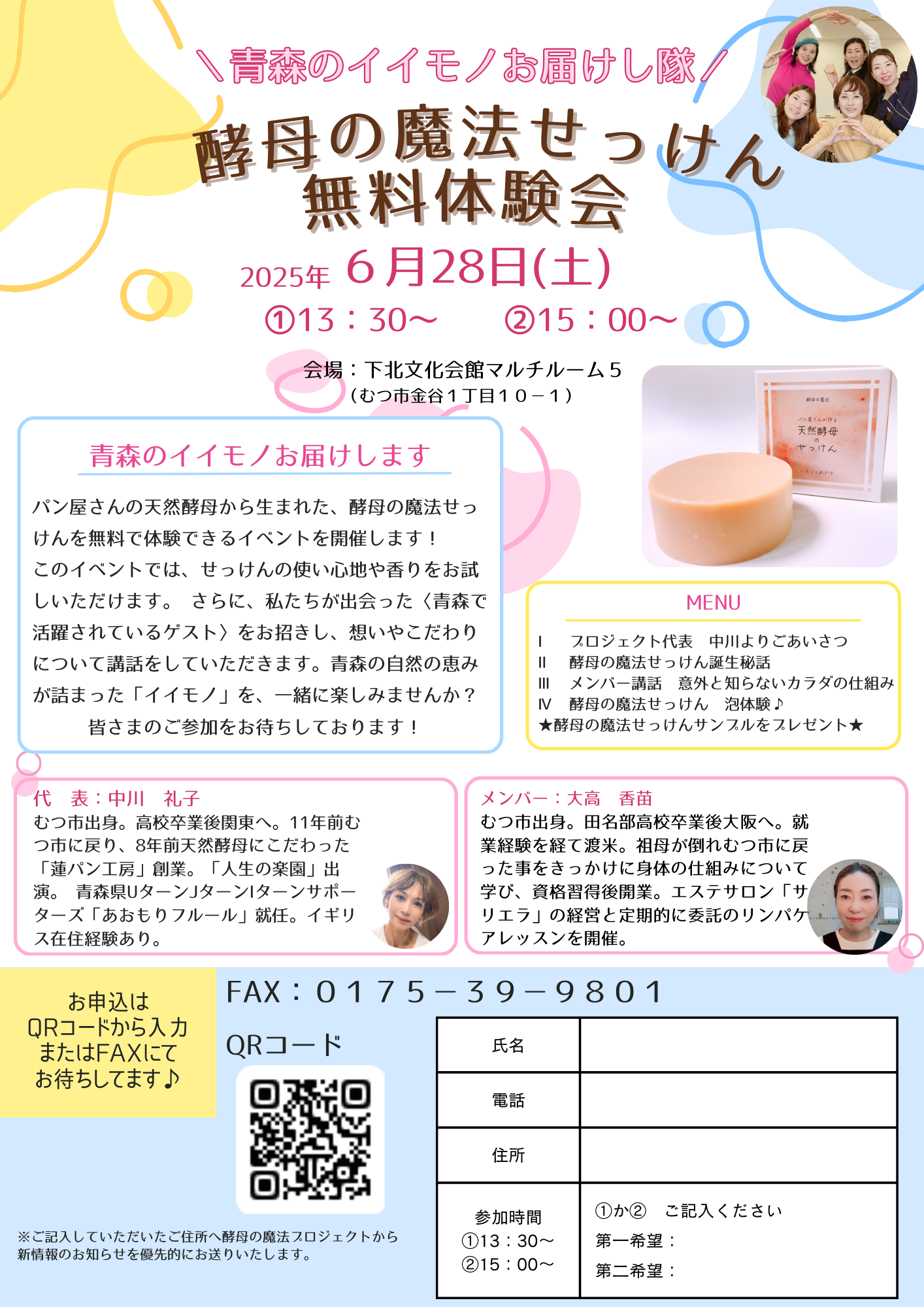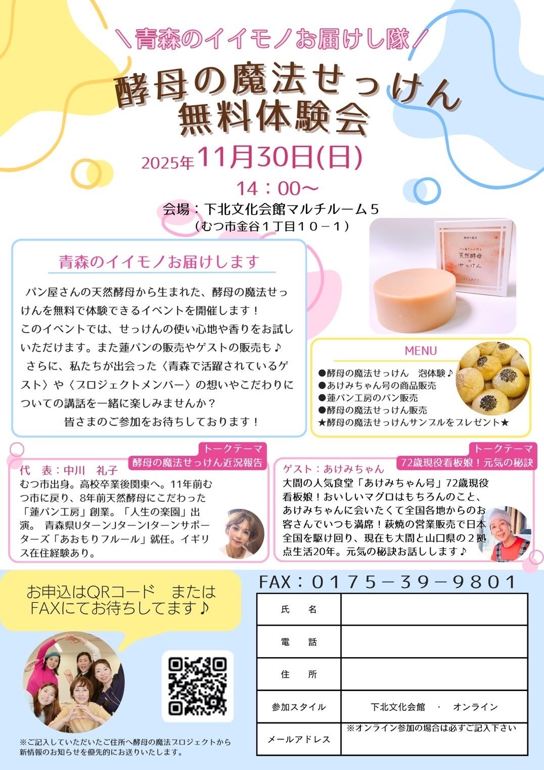 2025/10/30 17:21こんにちは☆メンバーのかなえるです(^○^)来たる!2025年11月30日(日)酵母の魔法プロジェクトのイベントを開催します!!!第二弾のゲストスピーカーは、大間の人気食堂『あけみちゃん号』72歳の現役看板娘です!!!おいしいマグロはもちろんのこと、あけみちゃんに会いたくて全国各地からのお客さんでいつも満席!酵母の魔法プロジェクトメンバーもあけみちゃんの大大大ファンです(^○^)萩焼の営業販売で日本全国を駆け巡り、現在も青森県下北半島の大間と山口県の2拠点生活を20年継続されております!そんなあけみちゃんが元気の秘訣をお話ししてくれます♪代表の中川からは、酵母の魔法プロジェクトが立ち上がった㊙情報や、シモキタを、青森を盛り上げていきたい!!!という私たちの熱い想いを原動力としたこれからの活動などもお伝えしていきたいと思っております(^^)このイベントは\青森のイイモノをお届けします/と題して、シリーズ化していきますので、楽しみにしていてください( ´ ▽ ` )なんと今回からオンライン参加が実現しました!!!※ストリームヤードを使用する予定です。申し込みは必須となりますので、画像のQRコードよりお申し込みくださいませ。 もっと見る酵母の魔法せっけん体験会を開催します♪