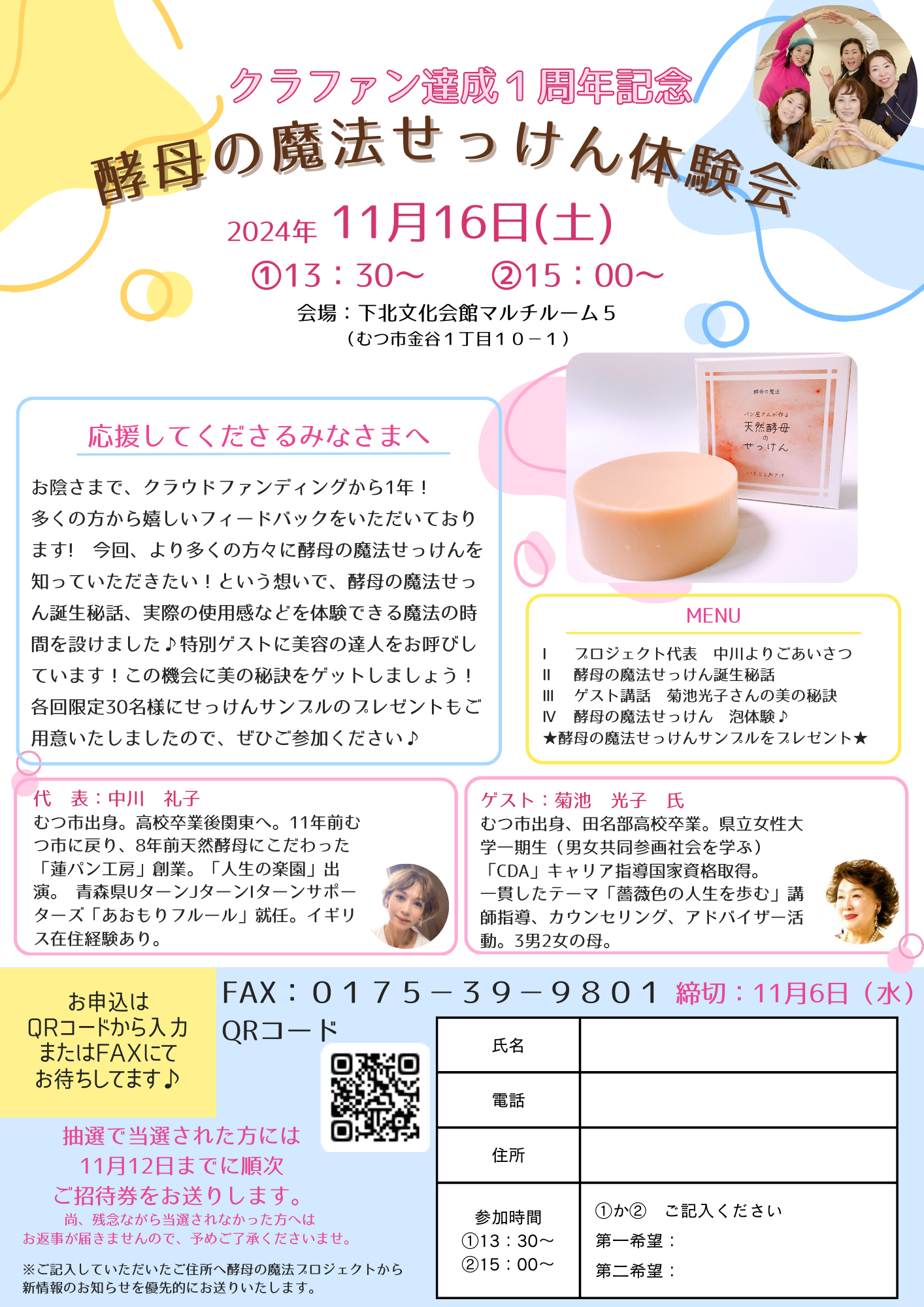 クラファン達成1周年記念!!酵母の魔法せっけん体験会開催決定!!【申込〆切延長!11月6日以降も受付ます】11/16土開催のせっけん無料体験会✖申込〆切11/6 → 絶賛受付継続中まだお席に余裕があるので\引き続き申込受付ます/お申込みはプロフィール欄のリンクから申込フォームに飛んでお申込みください♪完全無料★噂の美魔女登場★サンプルプレゼント11/16(土)酵母の魔法せっけん体験会にご興味のある皆様へ↓こちらの申込フォームから申込可お申し込みフォーム11/2に青森県下北地域の新聞折込チラシ【酵母の魔法せっけん体験会】こちら完全無料のイベントです(^^)サンプルの酵母のせっけんもプレゼントしちゃうめちゃくちゃお得なイベント!当日は、下北半島出身76歳の美容家、菊池光子さんが登場!ご自身も大変美しい方で、美しく歳を重ねる秘訣を伝授してくださいます!!!青森では珍しいイベントになるはずー(^^)皆さま、奮ってご応募下さい!下北地域以外のお客様もご応募可能です今ならまだ枠がありますのでぜひぜひ!!!ご応募後、メンバーよりご招待状をお送りします!