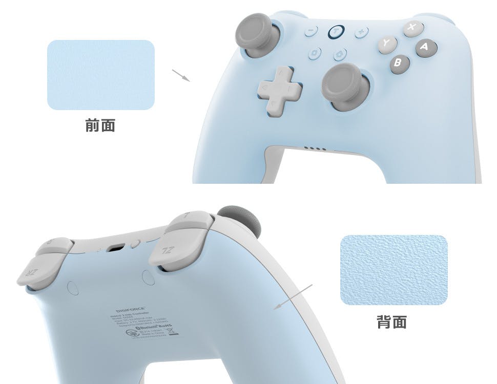 コントローラー本体の前面と背面では異なる質感になっています。前面は優しい手触りになるように、きめ細かな表面に仕上げました。背面は少しだけザラザラした質感にすることで、滑り止めの効果を持たせています。