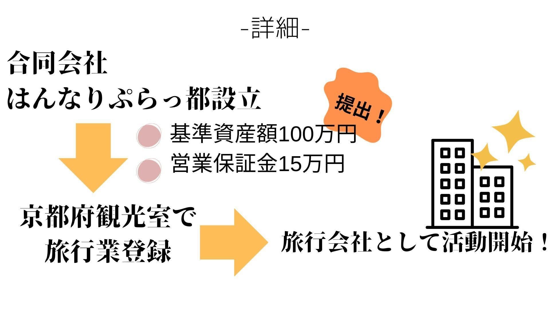 12月1日に会社登記を行い、「合同会社はんなりぷらっ都」を設立します。後に、12月8日に京都府観光室にて旅行会社登録を行います。その際に、基準資産額100万円と営業補償金15万円を提出しなければなりません。また、旅行業を行うためには、必ず旅行業務取扱管理者資格を所有している者が必要です。ですが、この資格はすでにメンバーが取得済みです。旅行会社を設立する資格は私たちに揃っています。後は、支援金を基準資産額と営業保証金にあて、旅行業を登録するのみです。