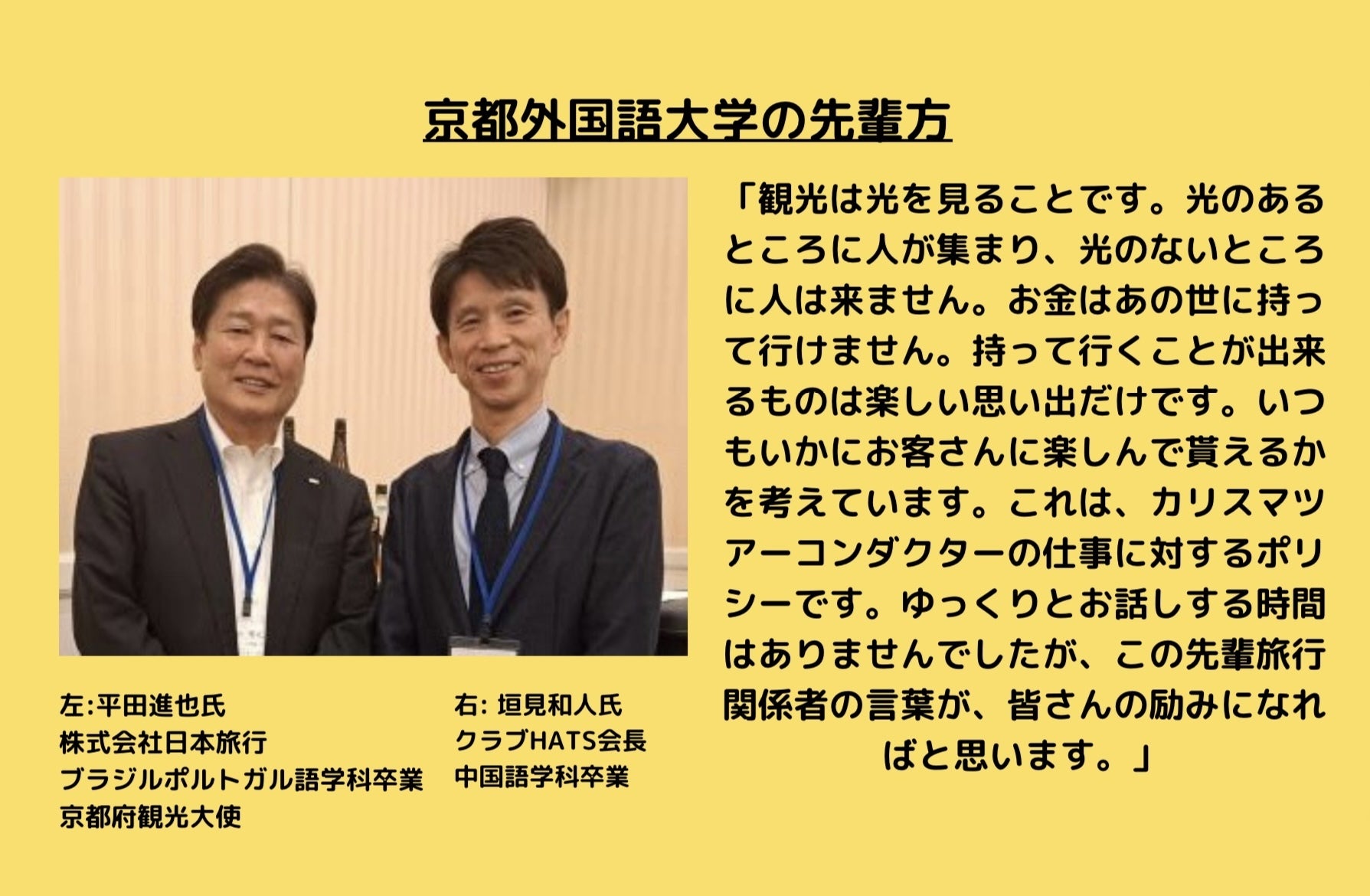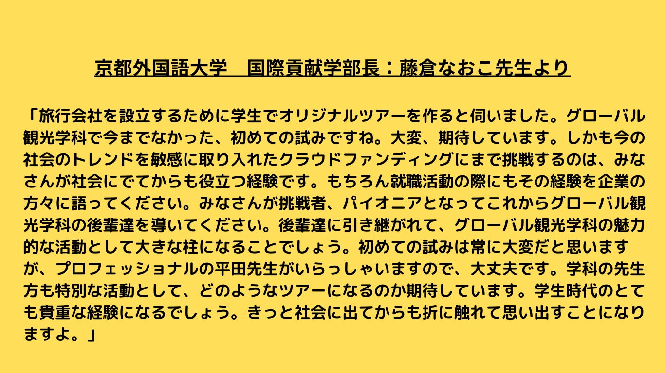 私たちは、大学生が添乗員として同行するツアーはおもしろいと考えています。一般的な添乗員は完成したツアーを、企業から委託されて、添乗員業務を行います。しかし、私たちは0からツアーを作り上げています。そのためこのツアーそのものに愛着が湧いています。そんな自信のあるツアーを、添乗員として1番近い距離で、支援者様に提供できることを嬉しく思っています。1番このツアーを理解し、魅力をすべて知っている私たちであるからこそ、添乗員として同行しこのツアーを盛り上げることができると確信しています!