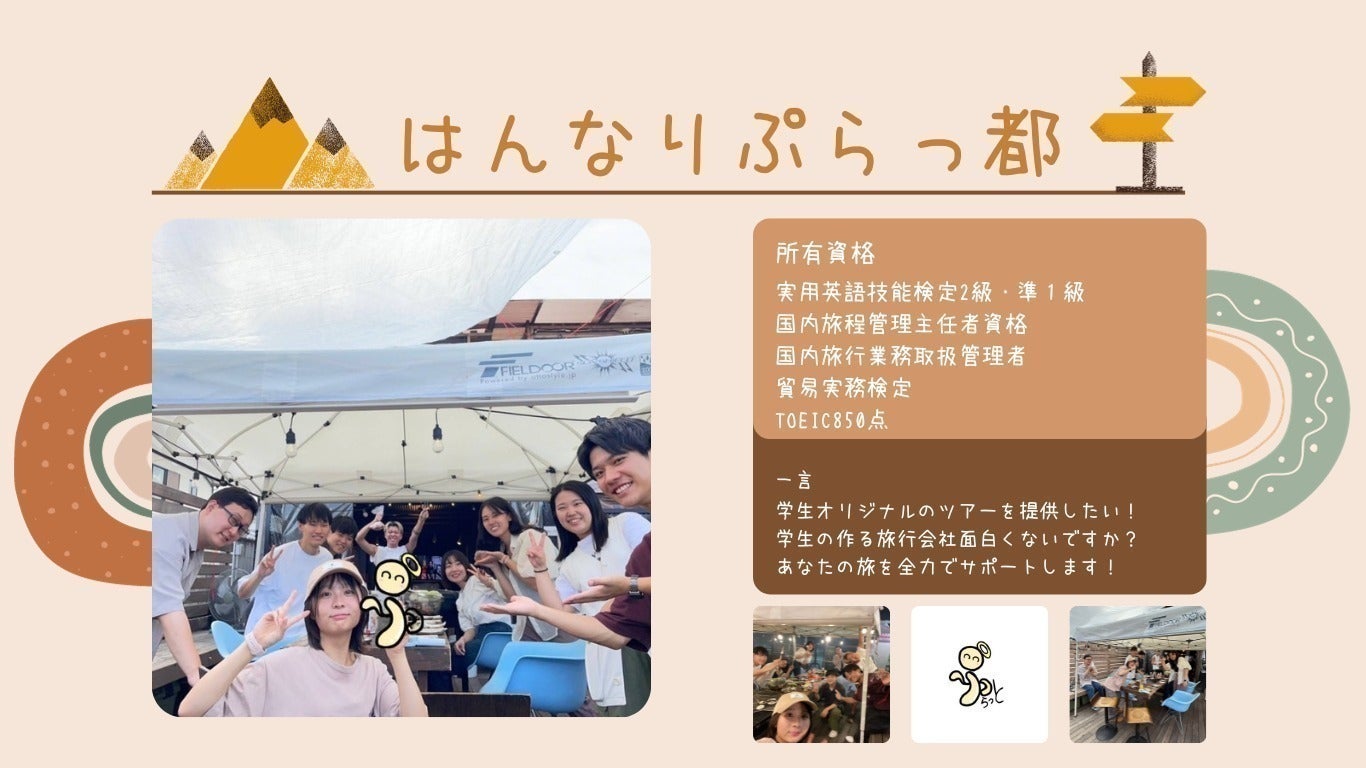 主な事業内容としてはタイトルにもある通り、学生らしさあふれる地域限定ツアーの立案から実行まで行います。また、市場のニーズにお応えするための、マーケティングとターゲティングも事業内容の1つです。ツアーを通して地域との関わりを持ち、地域と連携したツアーを実行できるような会社を目指してまいります。
