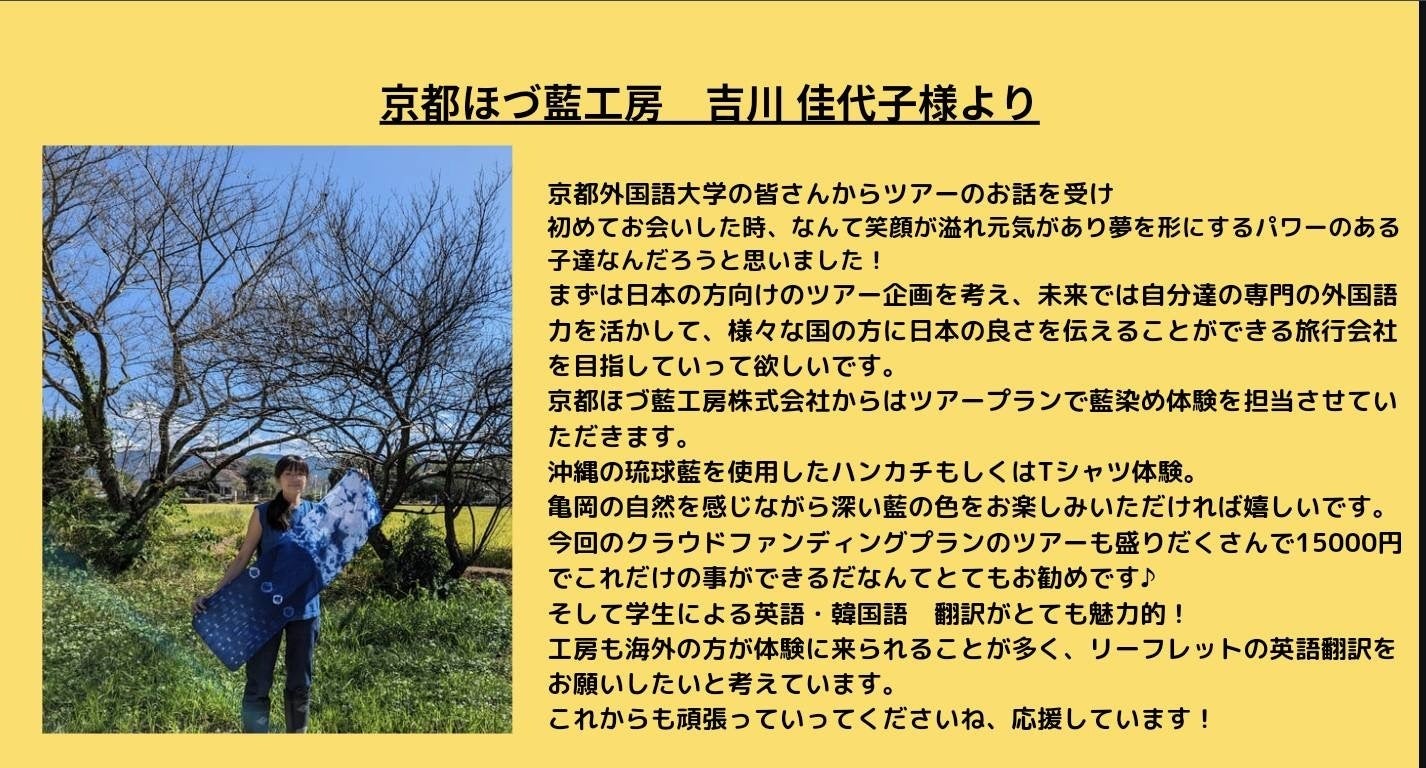 「京都ほづ藍工房」の吉川 佳代子様より応援メッセージをいただきました!!