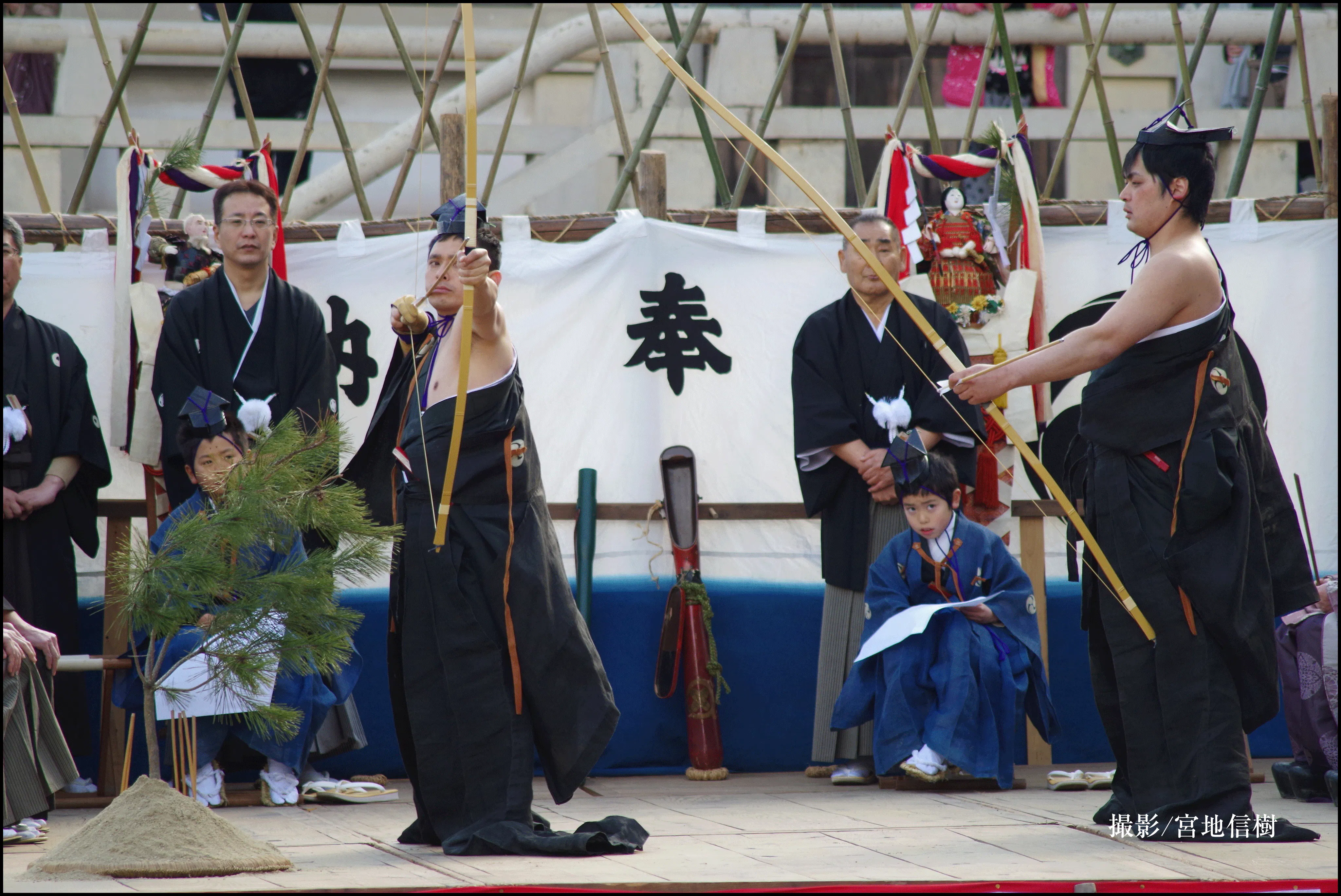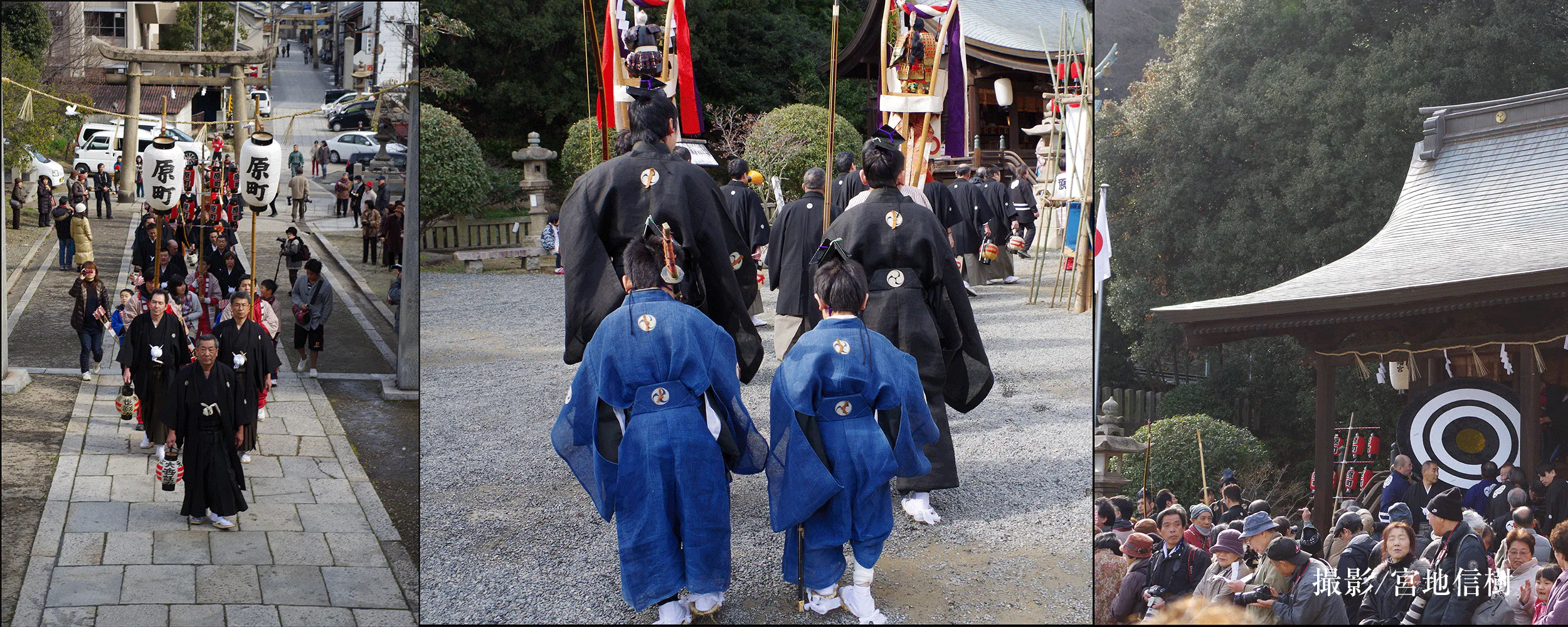 旧正月にあたる毎年2月に、沼名前神社の境内にある八幡神社において、悪鬼を射祓って、その年の無病息災、平穏無事を祈る神事として、福山市無形民俗文化財にも指定されています。