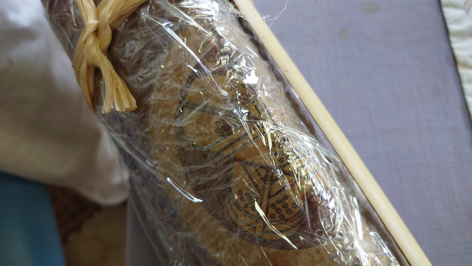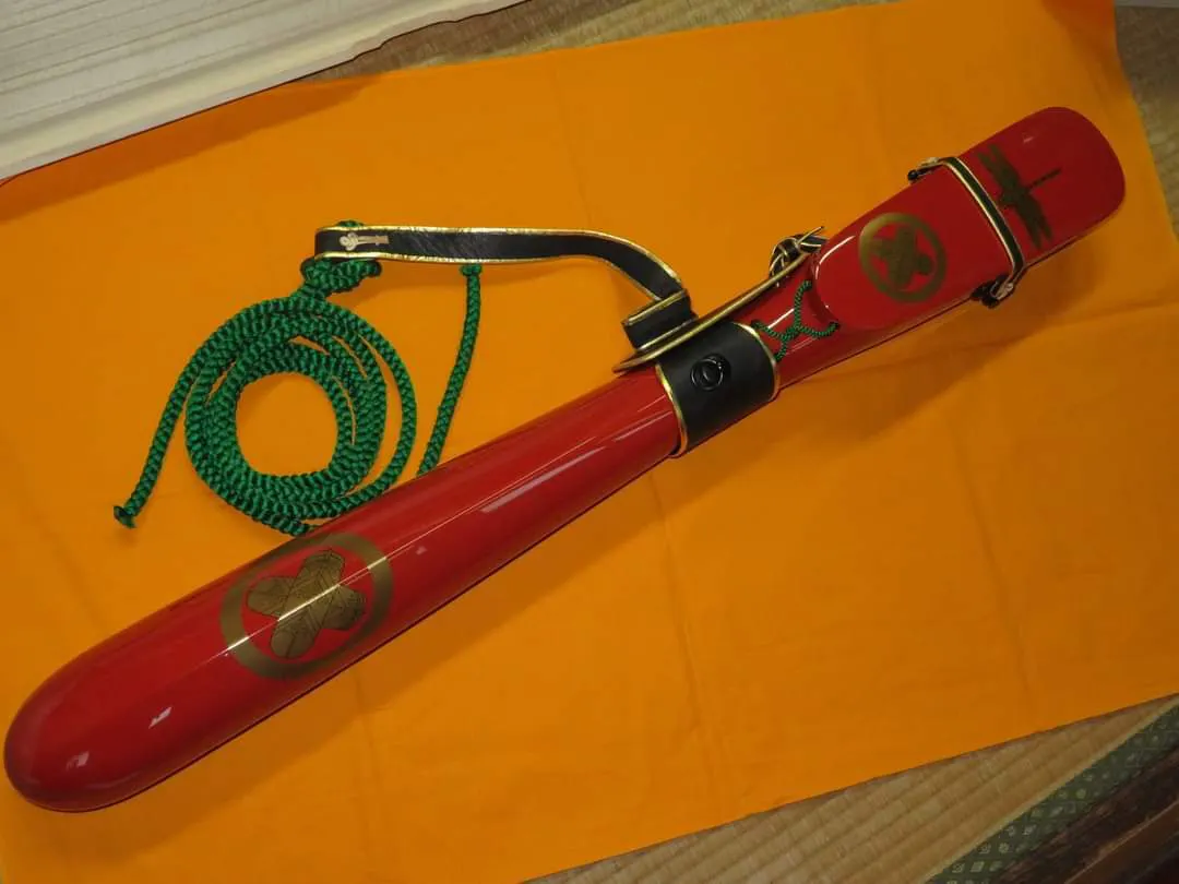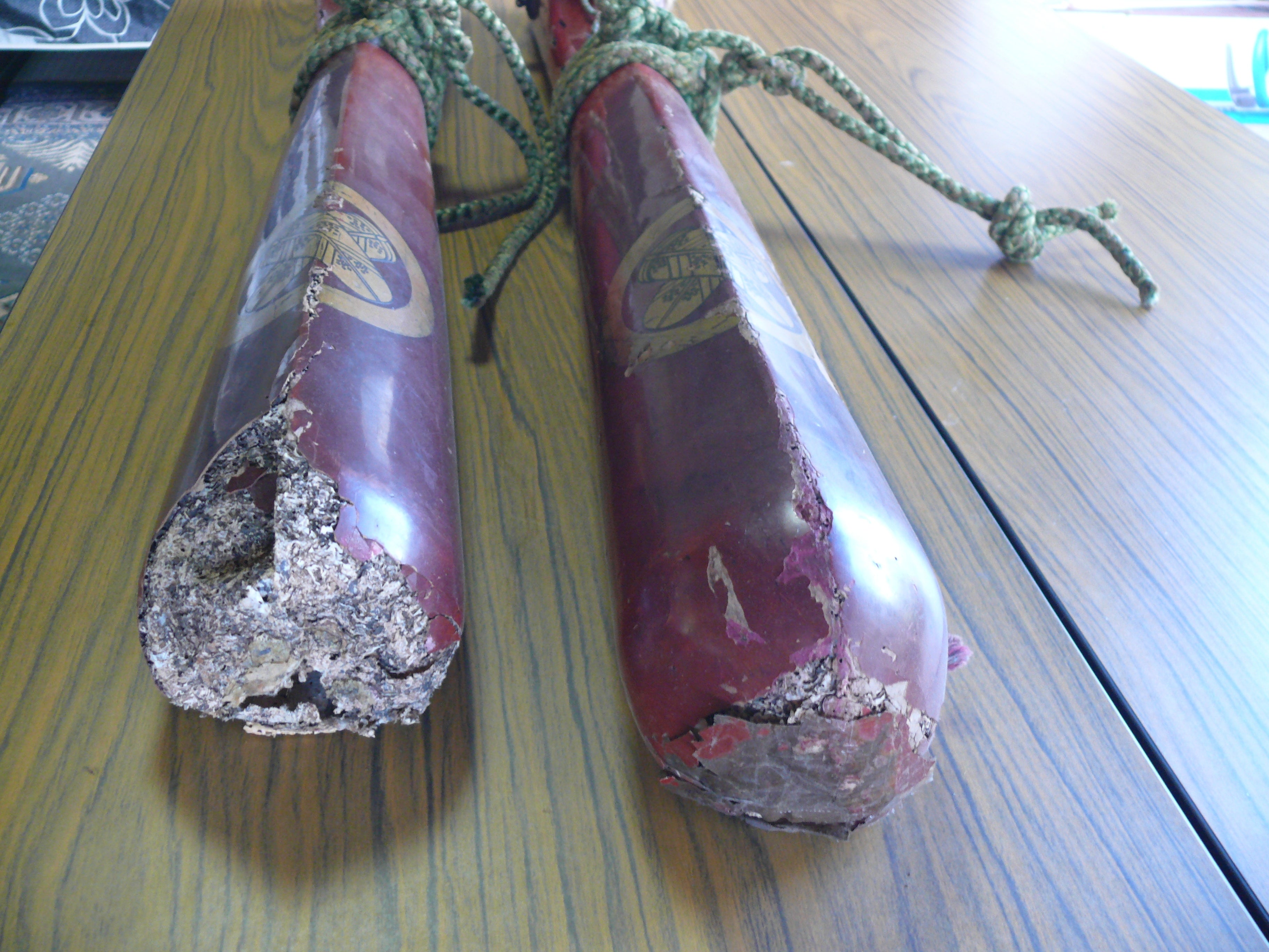 お弓神事では、古くから受け継いだ祭具を多く使うことになります。祭具のうち、こちらの写真は現在の矢筒の様子です。(長さ約100cm 矢筒は2本)神社の資料が残っておらず、いつ制作したかはっきりとされていませんが、昭和の初め頃と推測されています。お弓神事に使用される矢を収納するための矢筒で、乾漆(かんしつ)という紙を漆で塗り固める製法で作られています。そのため、雨風・湿気に弱く、これまで地域の支援者が竹で補修しながらなんとか使用していましたが、いよいよ作り直しが必要な状態になってしまいました。沼名前神社祭事運営委員会として、本格的に矢筒を修繕する方法を模索しましたが、大変難しいことが判明しました。なぜならこの矢筒を製作した乾漆技術は費用と時間がかかる製法のため衰退していることもあり、乾漆製法での修繕費用は新たな矢筒を作る費用と大差がありませんでした。