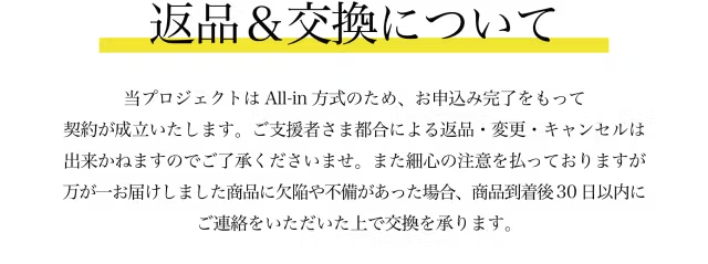 本文中に記載させていただいたスケジュールは、あくまでプロジェクト公開時点の予定です。支援の性質上、配送遅延のおそれがございます。 原則として、配送遅延に伴う支援のキャンセルはできませんが、リターン配送予定月から3ヵ月を超えた場合には、希望者に限りキャンセルにて対応させていただきます。