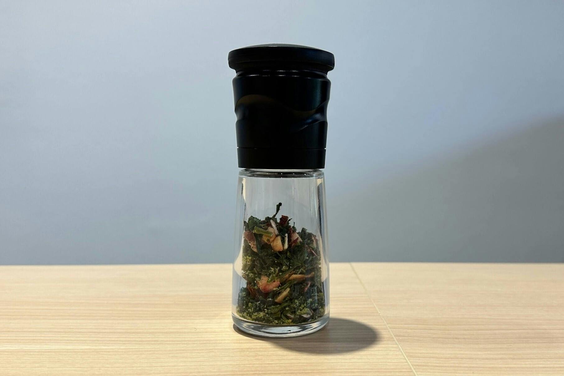 リッチゴふりかけには主にドライフルーツのように乾燥させたリッチゴと福井県産の規格外品になってしまった春菊を使用しています。そしてそれらをミルに入れて消費者が自分で削ることで削った瞬間特有の香り、削るということを楽しんでほしいと考えています。また、袋に入っているふりかけに比べ、自分でかけたい量を決めやすいという利点があります。