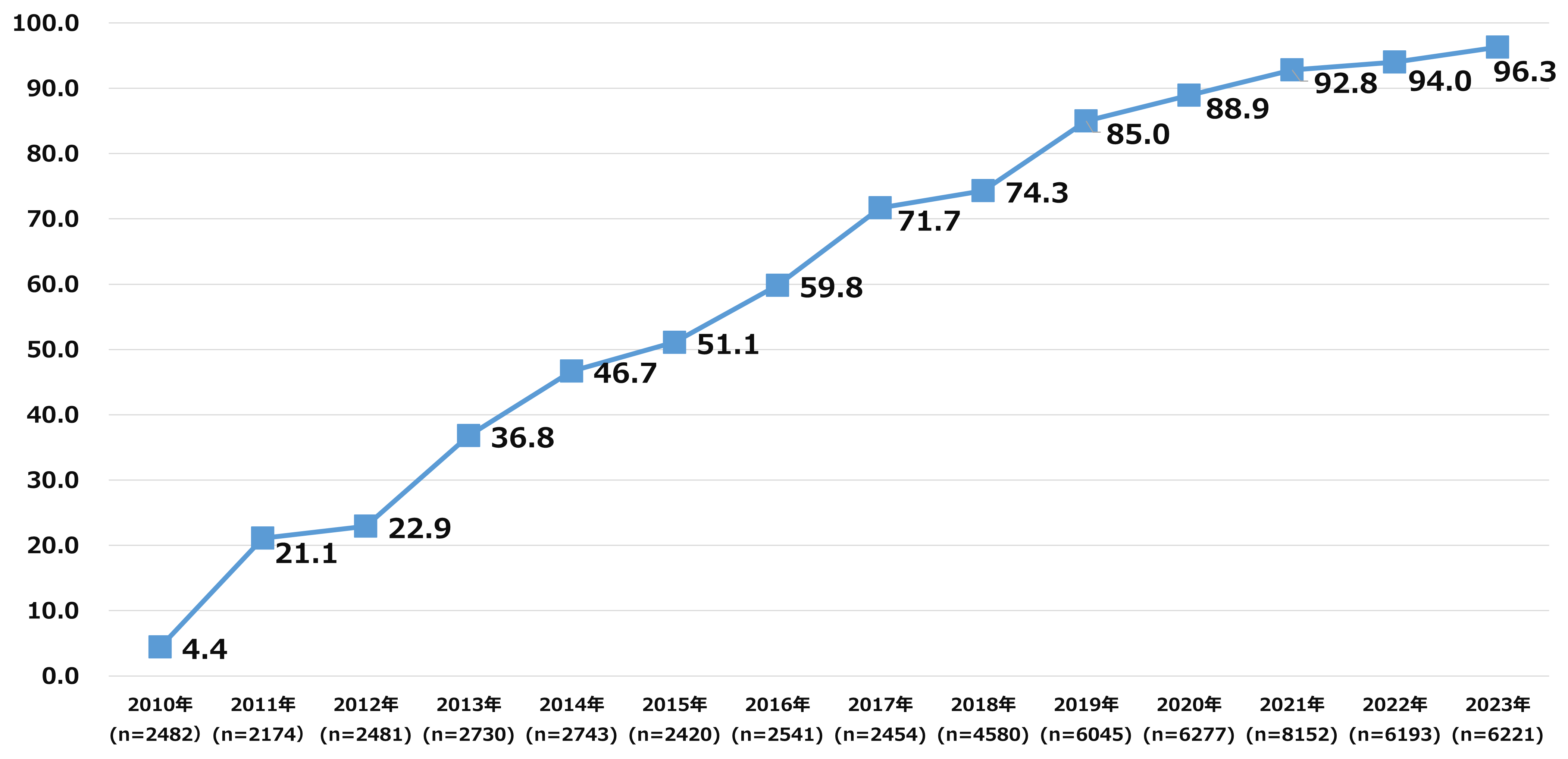 年々、日本国内における携帯電話所有者のスマホ比率は増加しており、2023年にはスマホ保有比率は96.3%になりました。