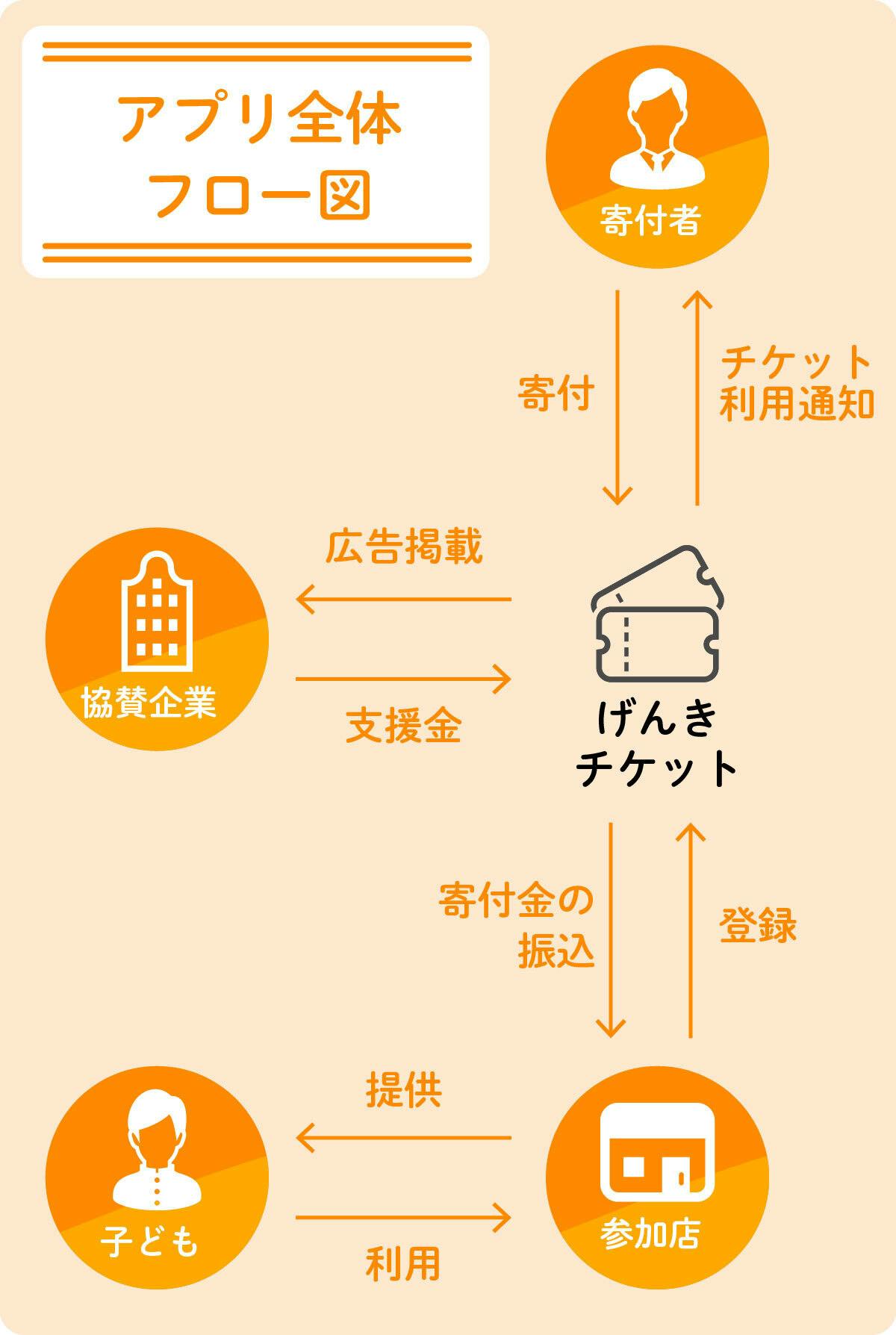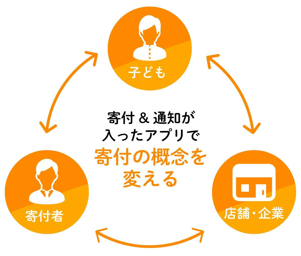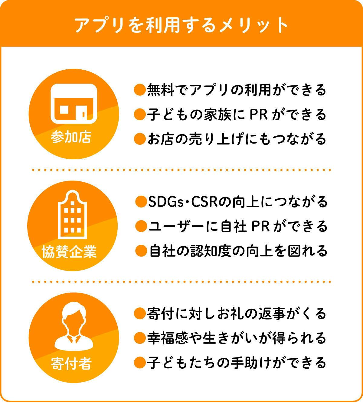 このアプリは、参加店舗・協賛企業・寄付者等の各関係者様からのご支援、ご協力によって、成り立つ仕組みとなっております。各関係者様がアプリを利用するメリットは以下の通りです。