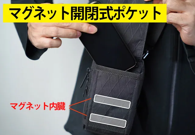 A、ポーチの蓋は、マジックテープと2箇所のマグネットで閉めることができます。スマホサイズに合わせて、ご利用いただけます。