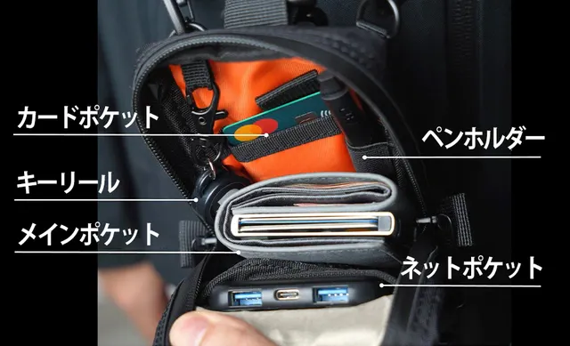 ストラップでショルダーバックとして、ベルトに通してウェストポーチとして、またバックパック用のサイドポーチとして。