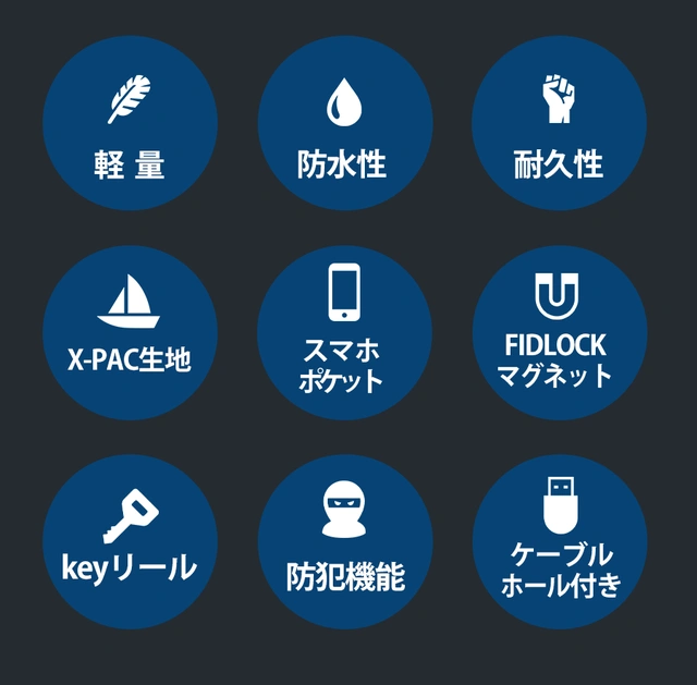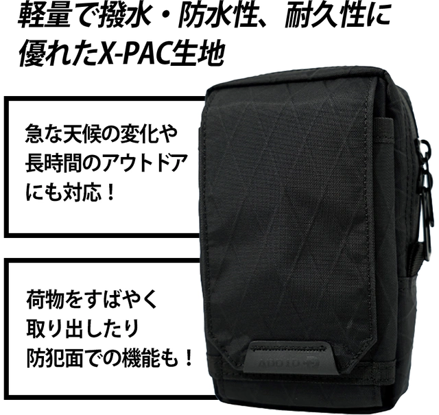 素材:防水性、耐久性、軽量の3つの利点を兼ね備えたX-PAC生地