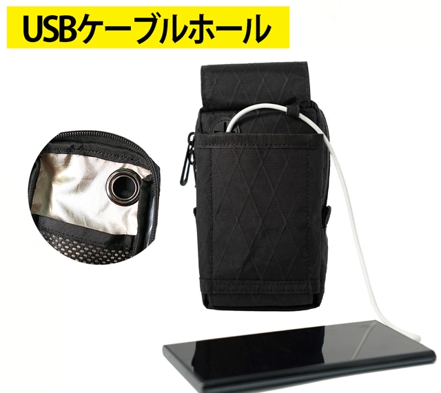 USBケーブルをホールに通せば、ポーチの中の充電器と繋いだまま、スマホを使うことができて便利です。