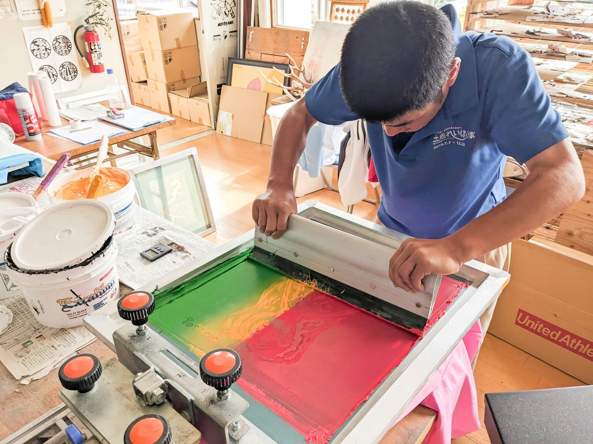 写真:弊社のシルクスクリーン工房で印刷する、土佐町のB型事業所の利用者さん。こういった工房を白ゆり内にも作りたいと思っています。