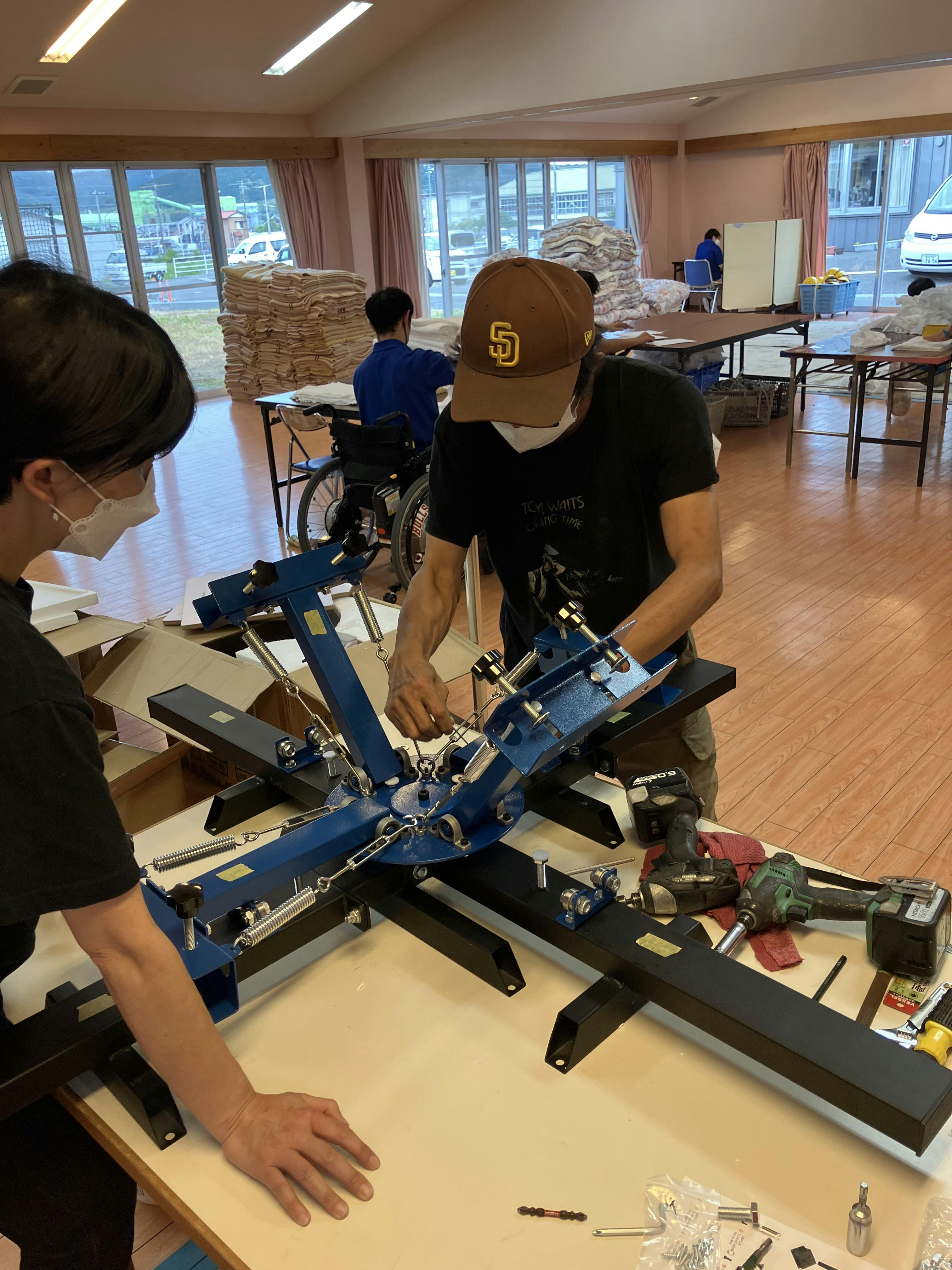 おかげさまで当プロジェクトは昨日の6/6、障害者施設「白ゆり」内でシルクスクリーン工房機材の組み立て設置を行いました。