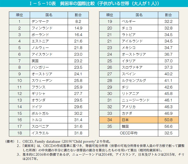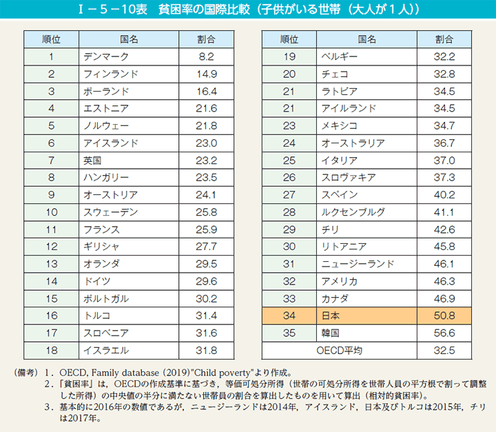 一方で、厚生労働省「国民生活基礎調査」(平成28年) によると、 母子世帯のうち37.6%が年間所得額200万円未満であり、45.1%が生活を「大変苦しい」と感じています。また、日本のひとり親世帯の貧困率を国際比較すると、OECD加盟35か国中34位と驚きの結果です。
