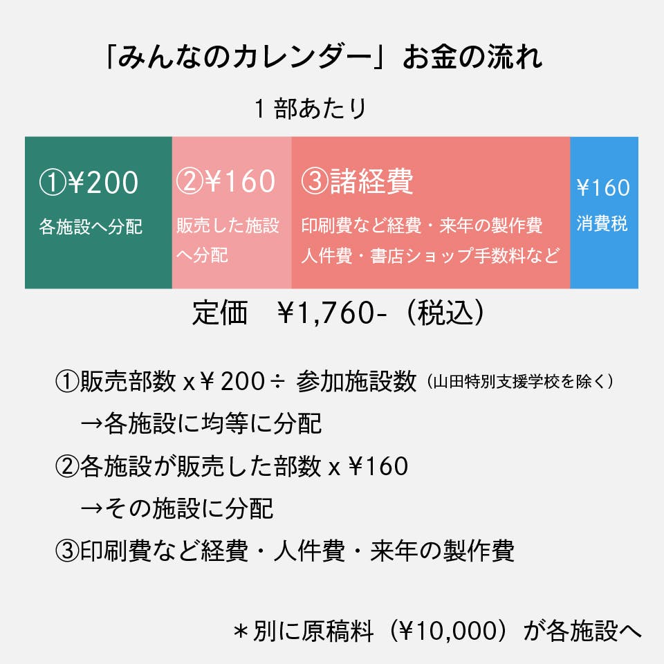①このうち一部あたり200円を各施設に均等に分配。例えば100部販売した場合、100部x200円➗7施設=2,857円が各施設へ。*参加が8施設なのに例が7施設なのは、公立校である山田特別支援学校が金銭の授受が難しいためです。