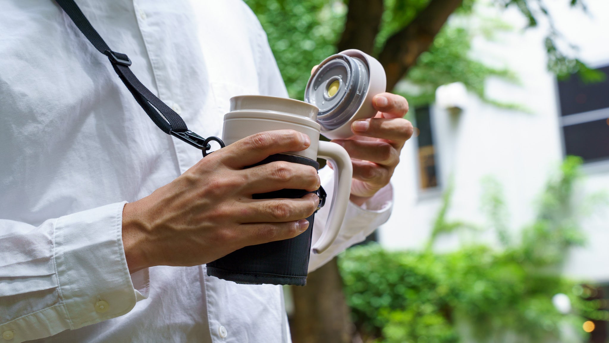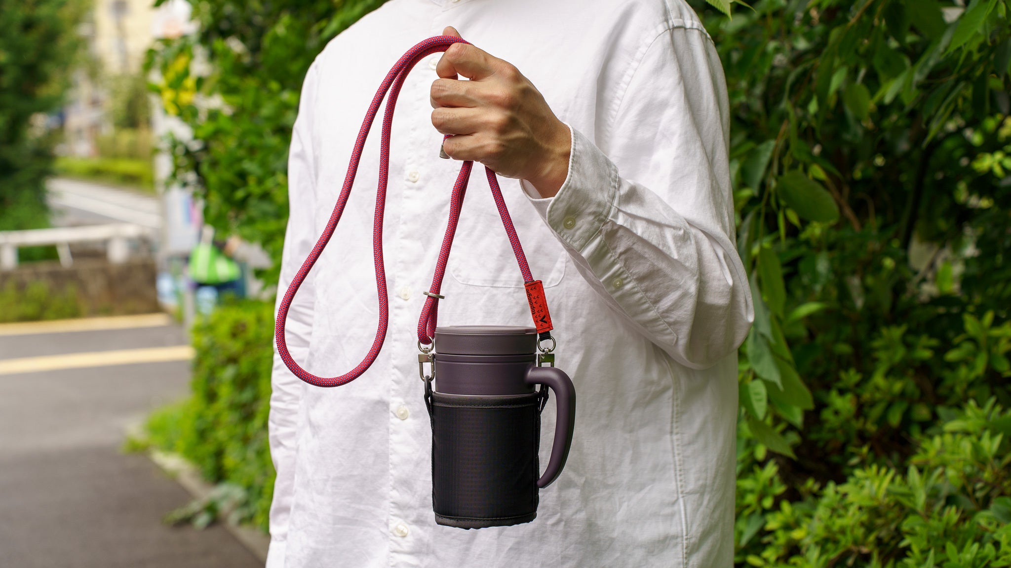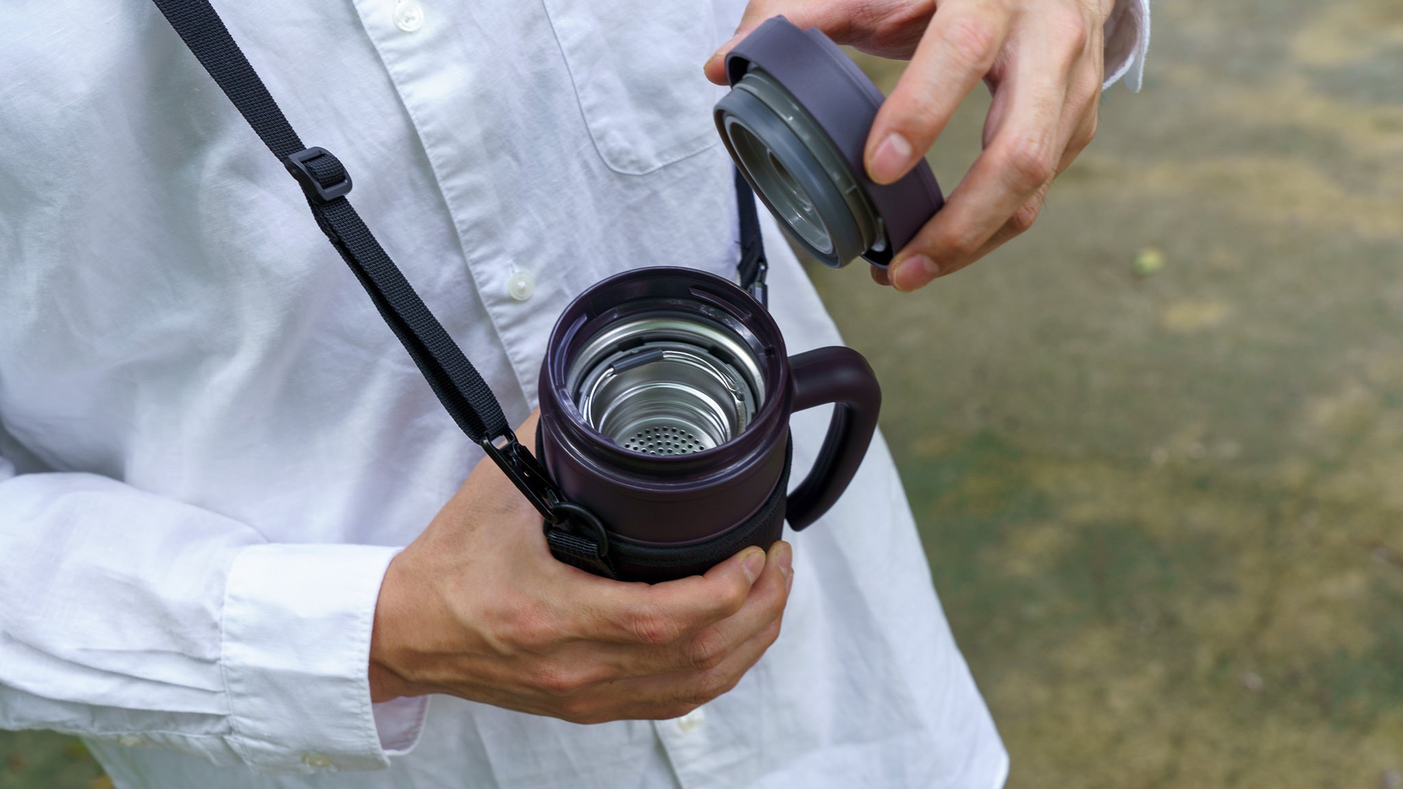ティーホルダーストラップは茶こしや持ち手の付いた使い勝手の良いタンブラーと、持ち運びに便利なオリジナルスリングカバーがセットになって、外出時のお茶問題を見事に解決してくれます。