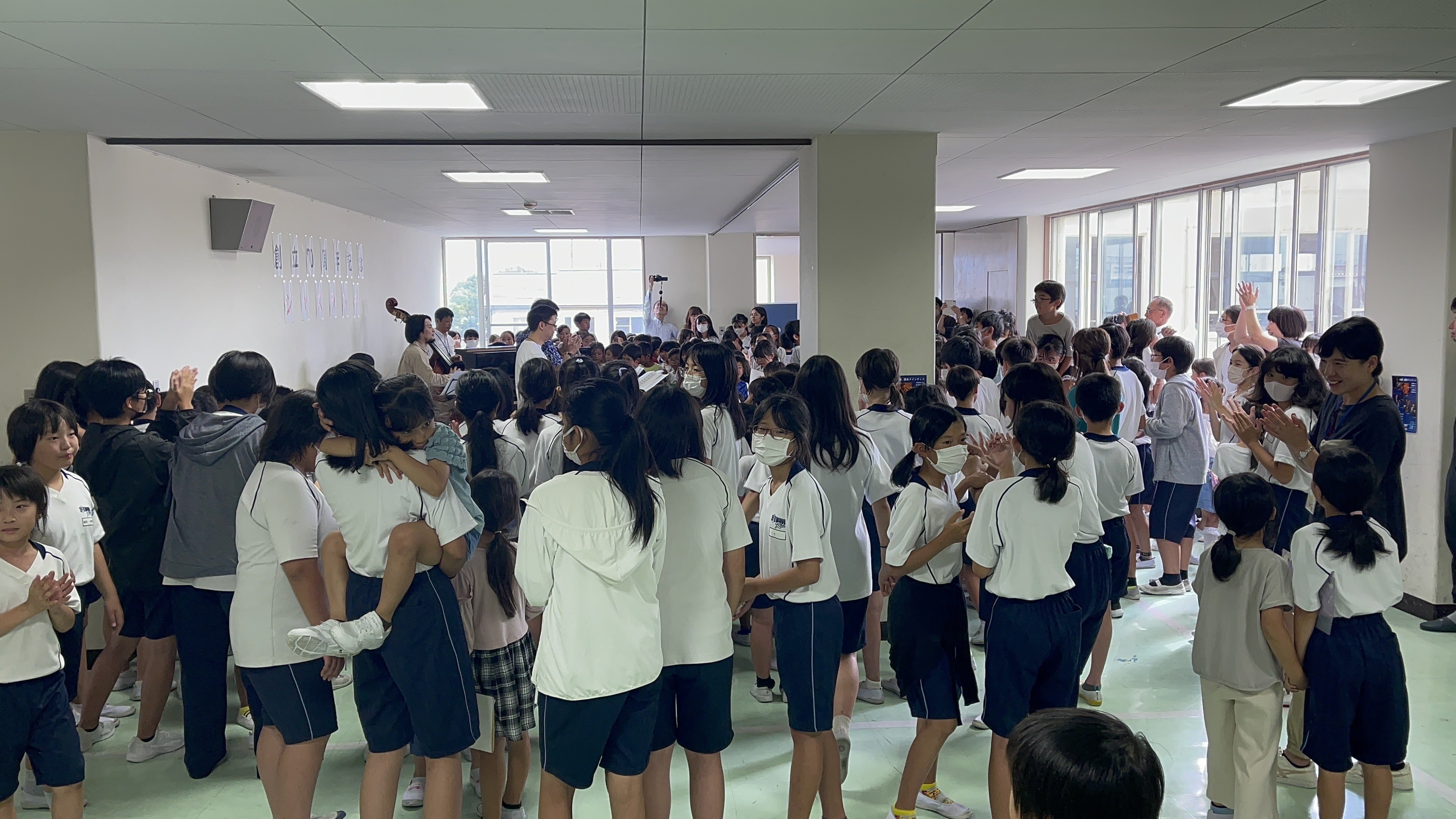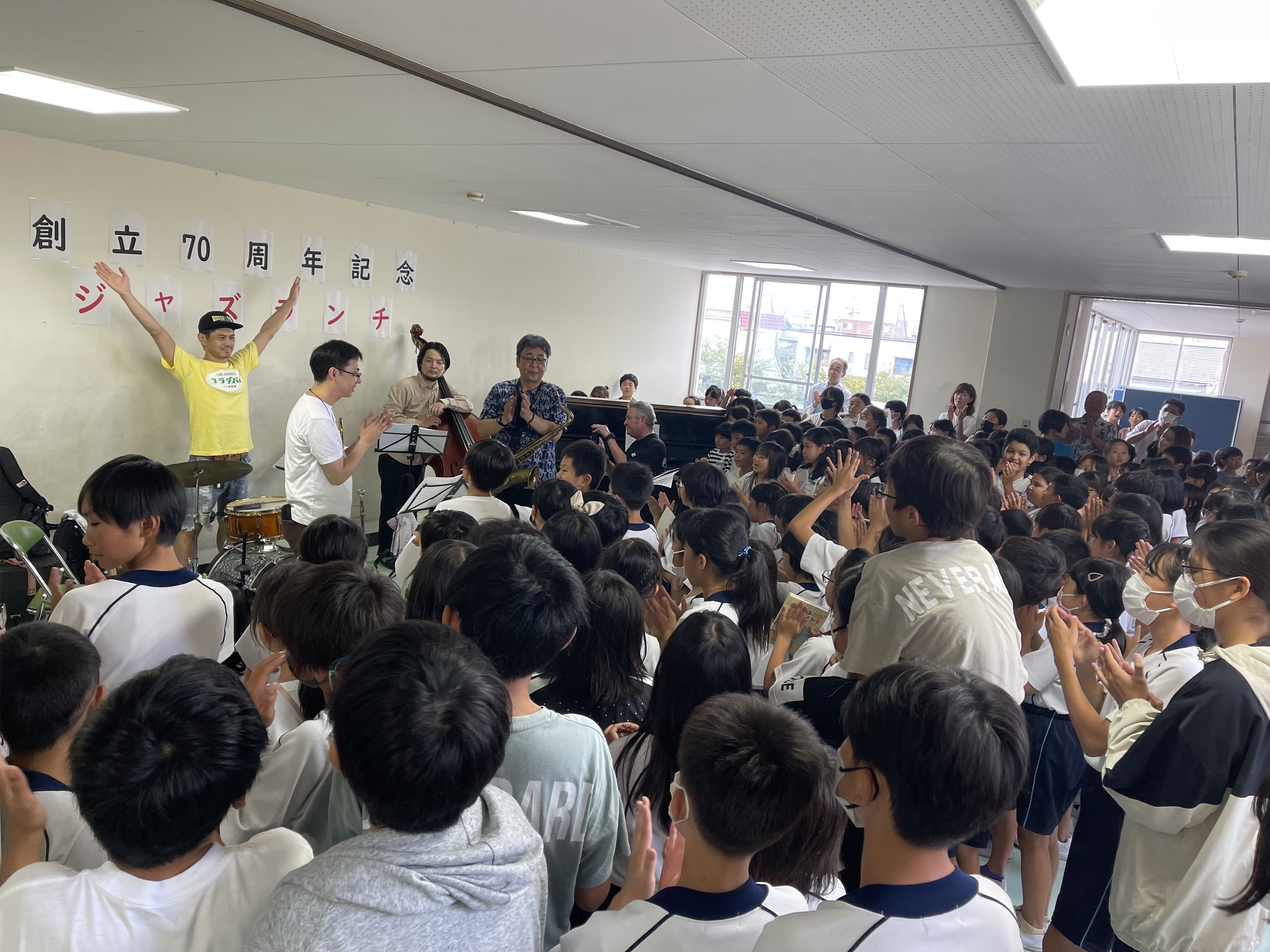 給食を食べ終えた児童が続々と2階の会場に集まり熱気ムンムン!本場のJAZZの演奏に目と耳で触れて手拍子ノリノリでした!最後は校歌の伴奏でみんな大合唱!大変盛り上がりました!