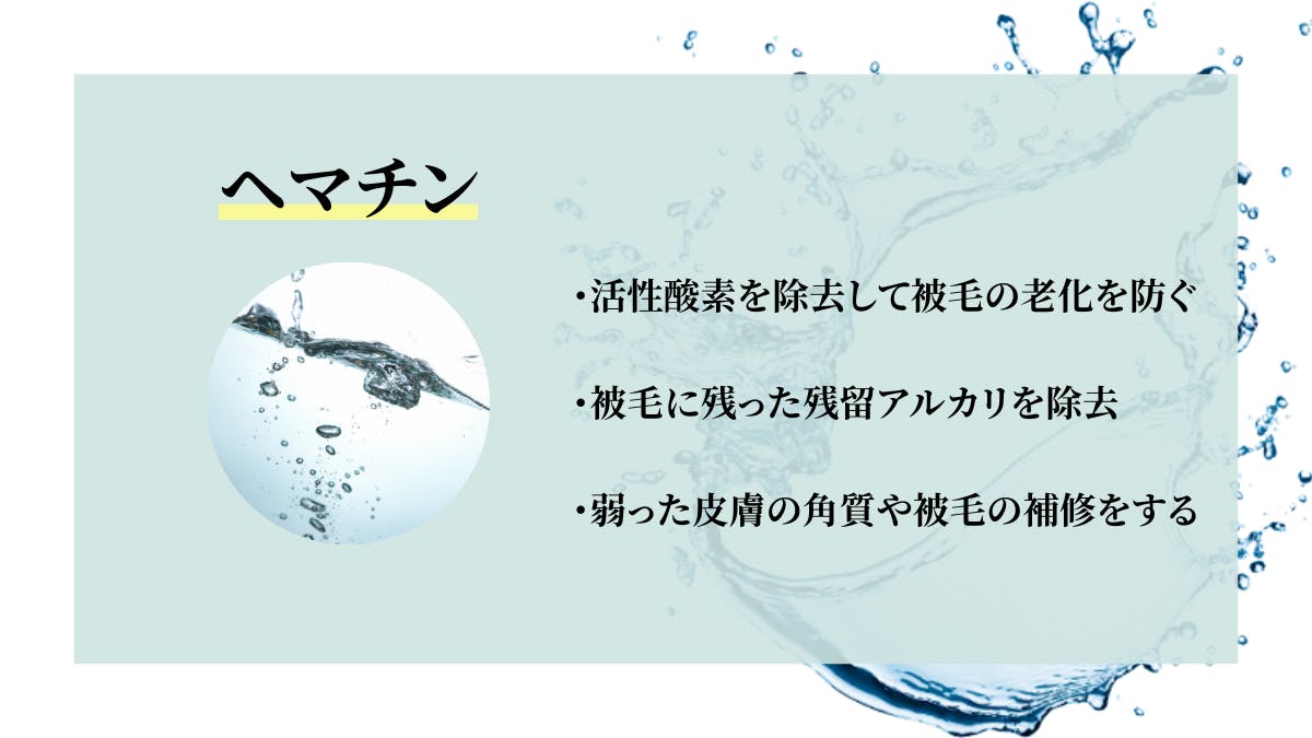 ヘマチンはこのケラチンたんぱく質と結びつき、被毛のダメージを補い、弱った皮膚の角質や