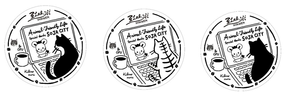 このクッキー缶のデザインと、コーヒーのドリップバッグをまとめているOPP袋に貼ってあるシールは、私たちの先輩である、県大の卒業生、広石かよさんが作ってくださいました! ロイ君をイメージしたぶち猫、よつば君をイメージしたキジトラ、ゴシック君をイメージした黒猫の3匹のねこちゃん達と、総社市のマスコットチュッピーが登場しています! セット名にあったねこちゃん達のシールをお届けします!(※3匹の猫セットのみシールはランダムです。)