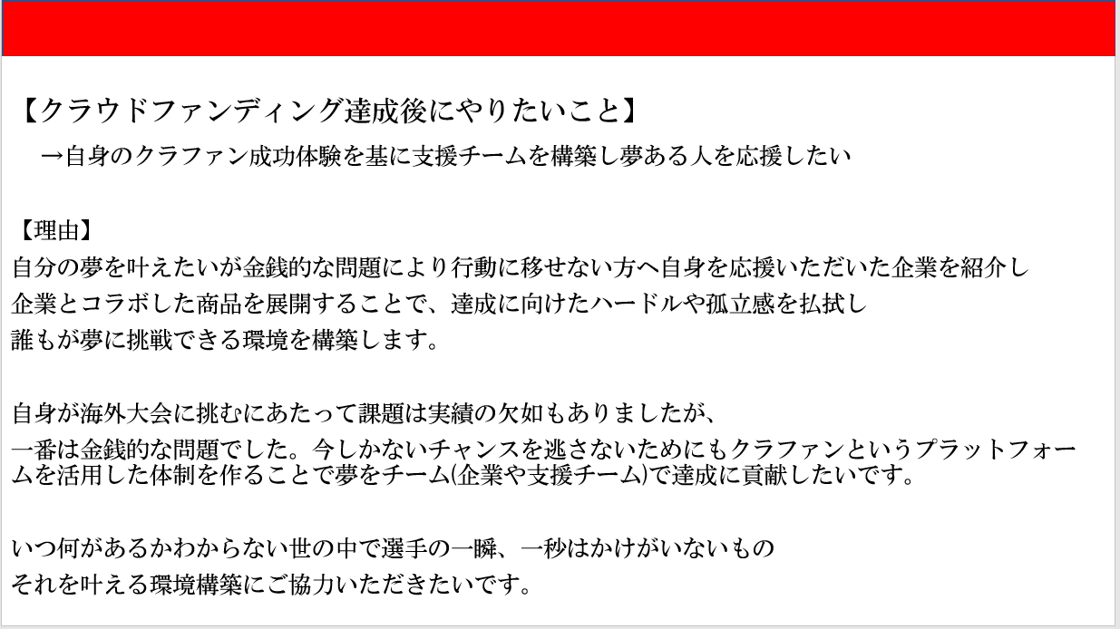 この成功は、クラウドファンディング、支援者、そして支援企業の皆様のおかげで実現しました。クラウドファンディングは私の競技の夢を実現するために欠かせない要素であり、皆様の寛大な支援と信頼により、トレーニング、サプリメント、競技用具、ケアなど、必要なリソースを手に入れることができました。