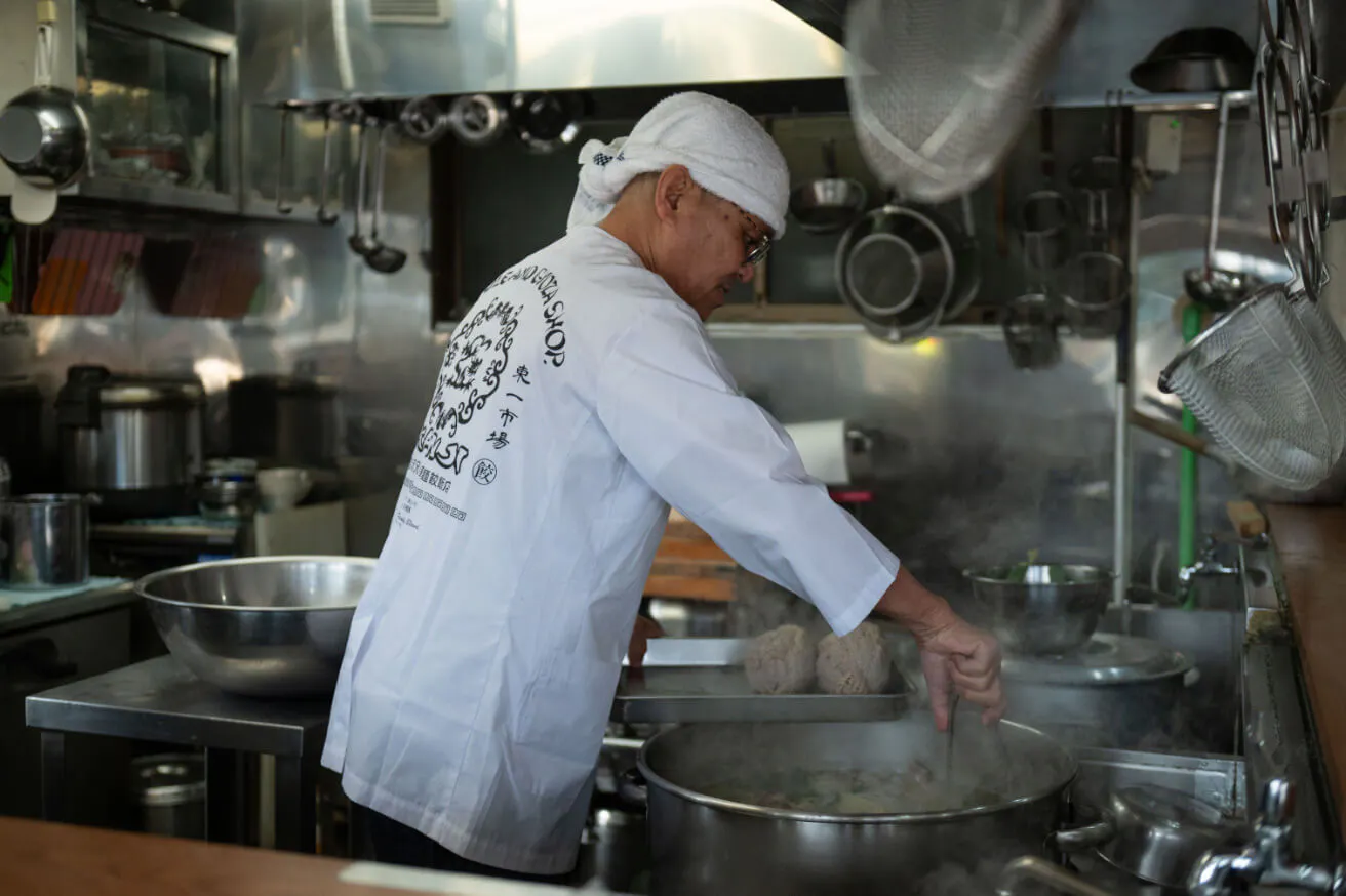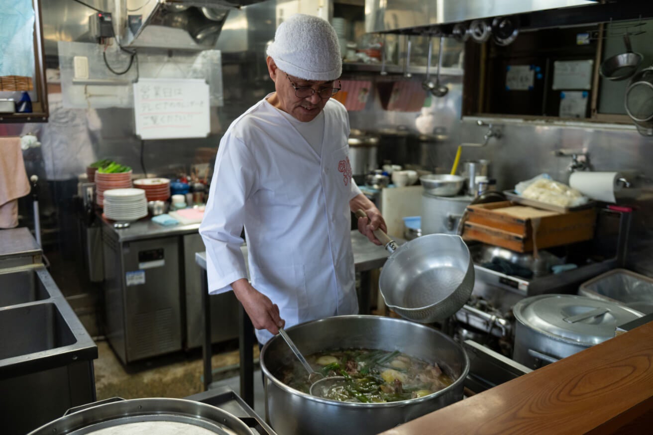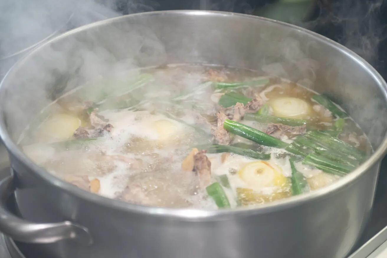豚、鶏、煮干しや玉ねぎなどの香味野菜でつくるスープは、5時間半は煮込みます。