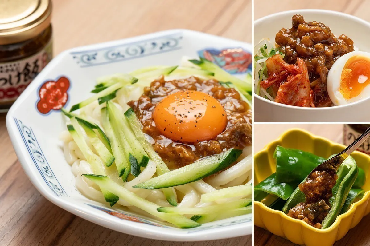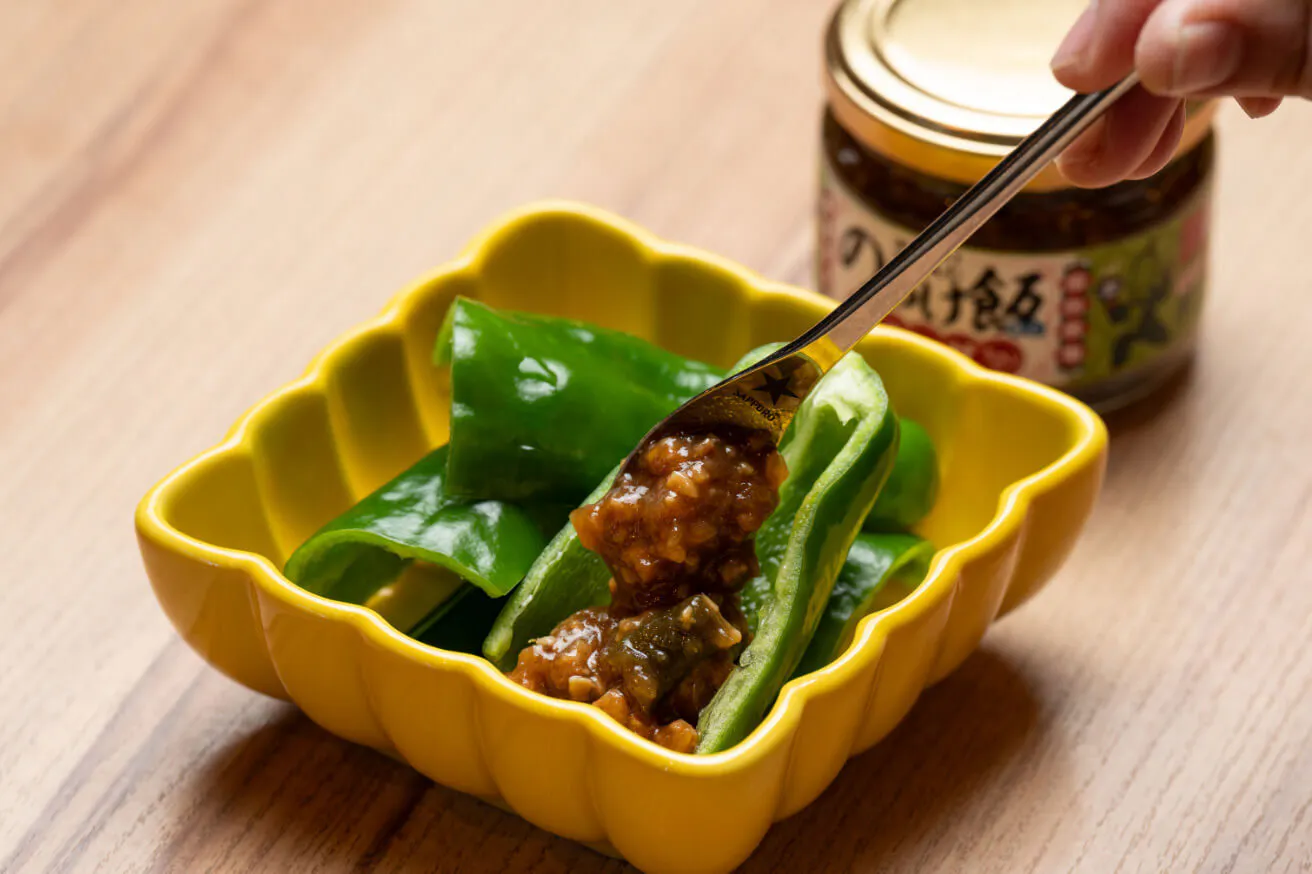 辛いものがお好きな方におすすめの「のっけ飯 青唐辛子」は、ピーマンに乗せてディップ風にしたり、もやしと豆苗を炒めたものにトッピングしてみたり、茹でたうどんと和えてじゃじゃ麺風にしたり…。