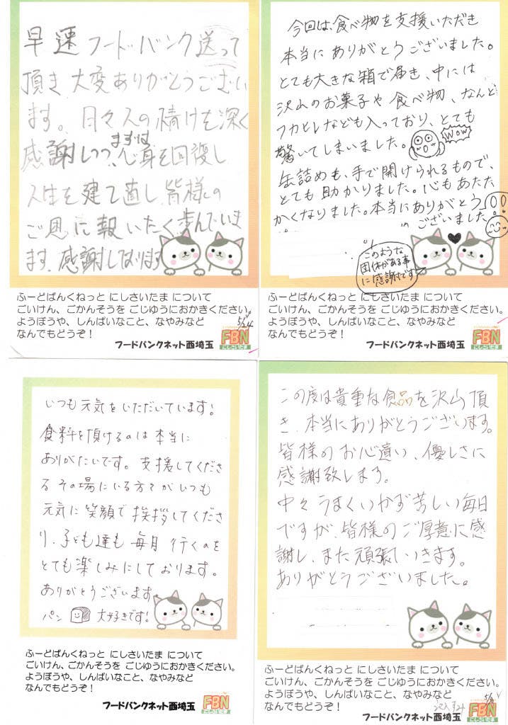 この度は貴重な食品を沢山頂き、本当にありがとうございます。皆様のお心遣い、優しさに感謝致します。中々うまくいかず苦しい毎日ですが、皆様のご厚意に感謝し、また頑張っていきます。ありがとうございました。