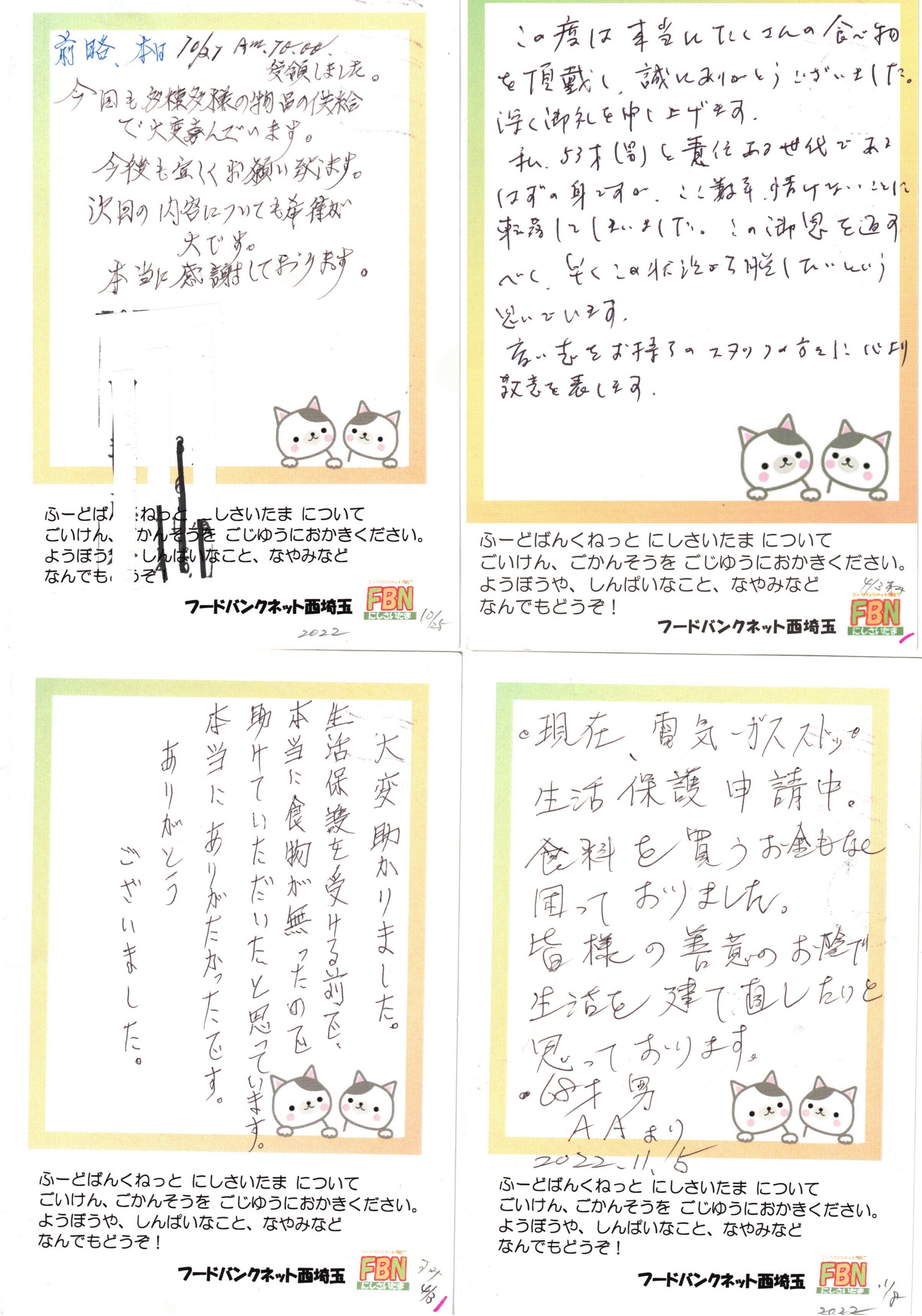 この度は本当にたくさんの食べ物を頂戴し、誠にありがとうございました。深く御礼を申し上げます。私、53才(男)と責任ある世代であるはずの身ですが、ここ数年、情けないことに転落してしまいました。この御恩を返すべく、早くこの状況から脱したいという思いでいます。良い志をお持ちのスタッフの方々に心より敬意を表します。