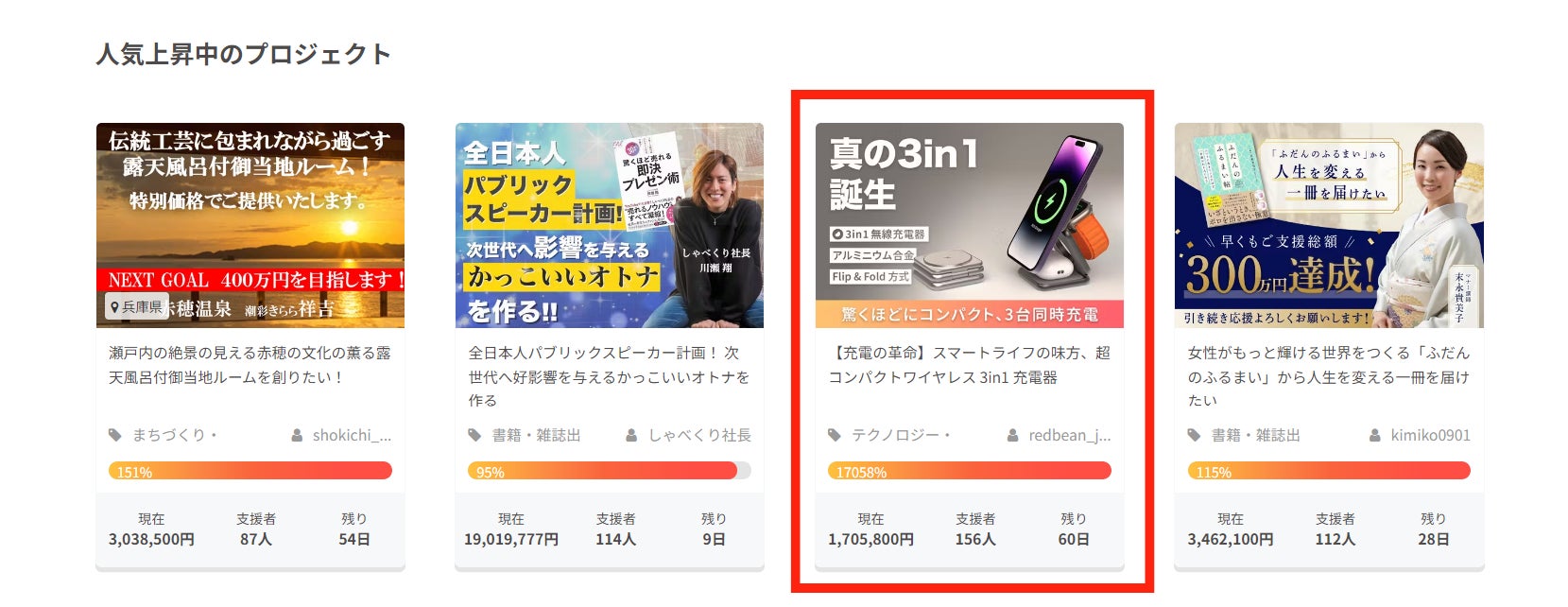 皆様の暖かいご支援のおかげで、公開から1日で達成率が17177%・支援者数158人を超え、人気上昇中のプロジェクト上位に配置されました!