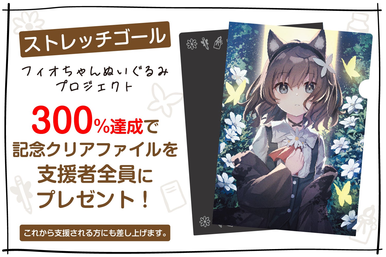 2023/08/11 10:00CAMPFIREスタッフです。たくさんのご支援ありがとうございます。この度ストレッチゴールを設定しました!300%達成で支援者「全員」にクリアファイルプレゼントいたします。これから支援された方もプレゼント対象となります!フィオちゃんが可愛い特別なデザインのA4クリアファイルです。この企画でしか手に入らないオリジナルアイテムです。残り40%でストレッチゴール達成となりますのでぜひご支援のご検討よろしくお願いいたします。引き続き応援お願いします!CAMPFIREスタッフ もっと見る