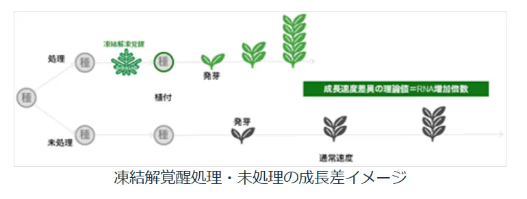 氷河期の凍結・解凍現象を人工的に再現する、バナナの種子や成長細胞を-60℃までゆっくりと冷却し、環境情報を一度リセットさせます。これにより、解凍の過程で環境順応性や成長速度などに関与する遺伝子の発現が行われ、寒さに強く、甘みの強いバナナとなります。