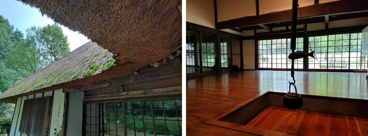 雨水は茅の表面をつたってぽたぽたと地面に落ち、建物内部に雨水が入ることはありません。よく乾燥させた茅は雨に強く、通気性が高いので湿気を逃してくれます。中に入ると、吸い込まれるような静けさに包まれます。かつて里山のシンボルであったこうした茅葺き民家は見られなくなってきています。