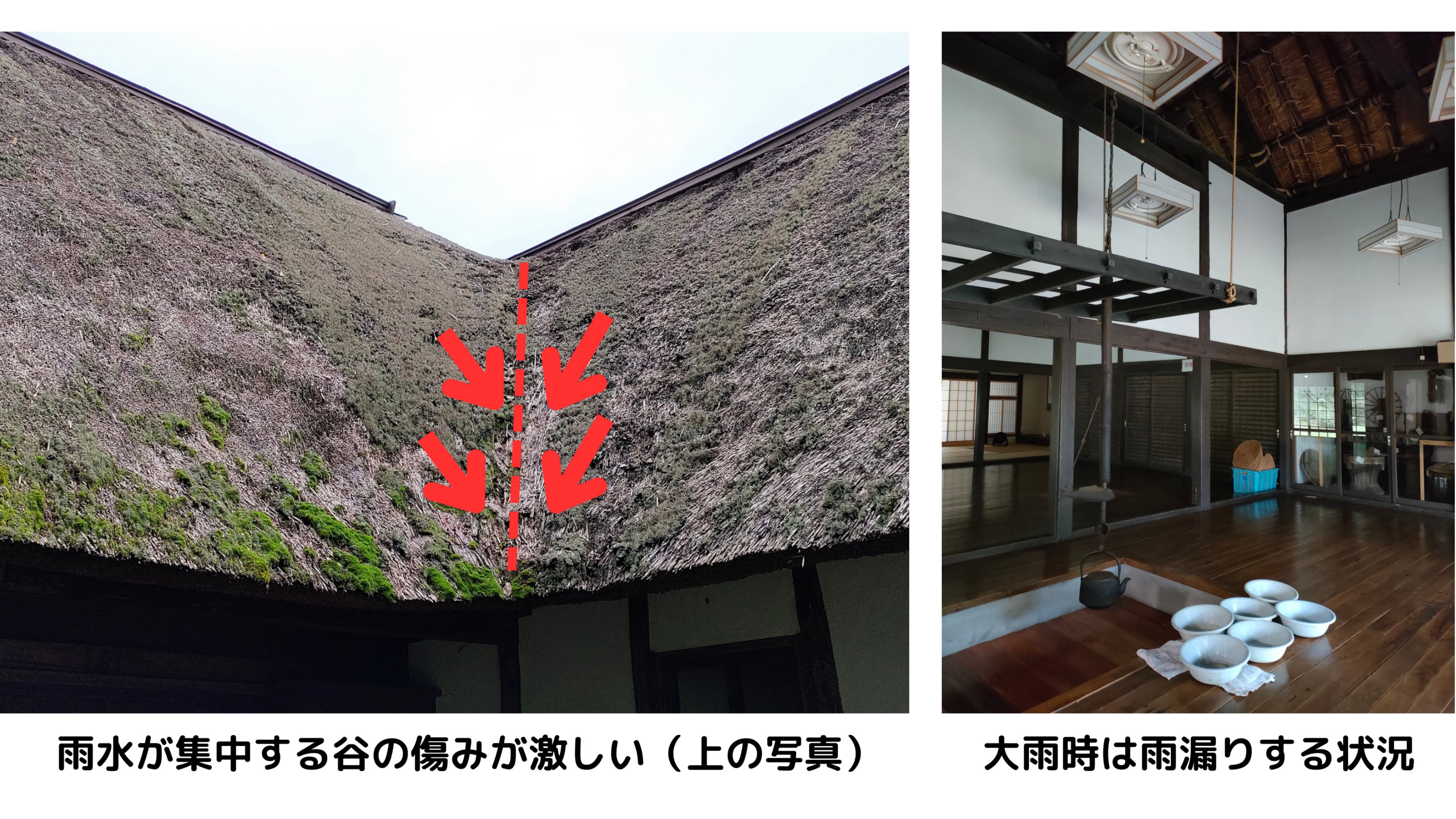 しかし、50年が経ち、茅葺き屋根の老朽化による雨漏りが目立つように…。