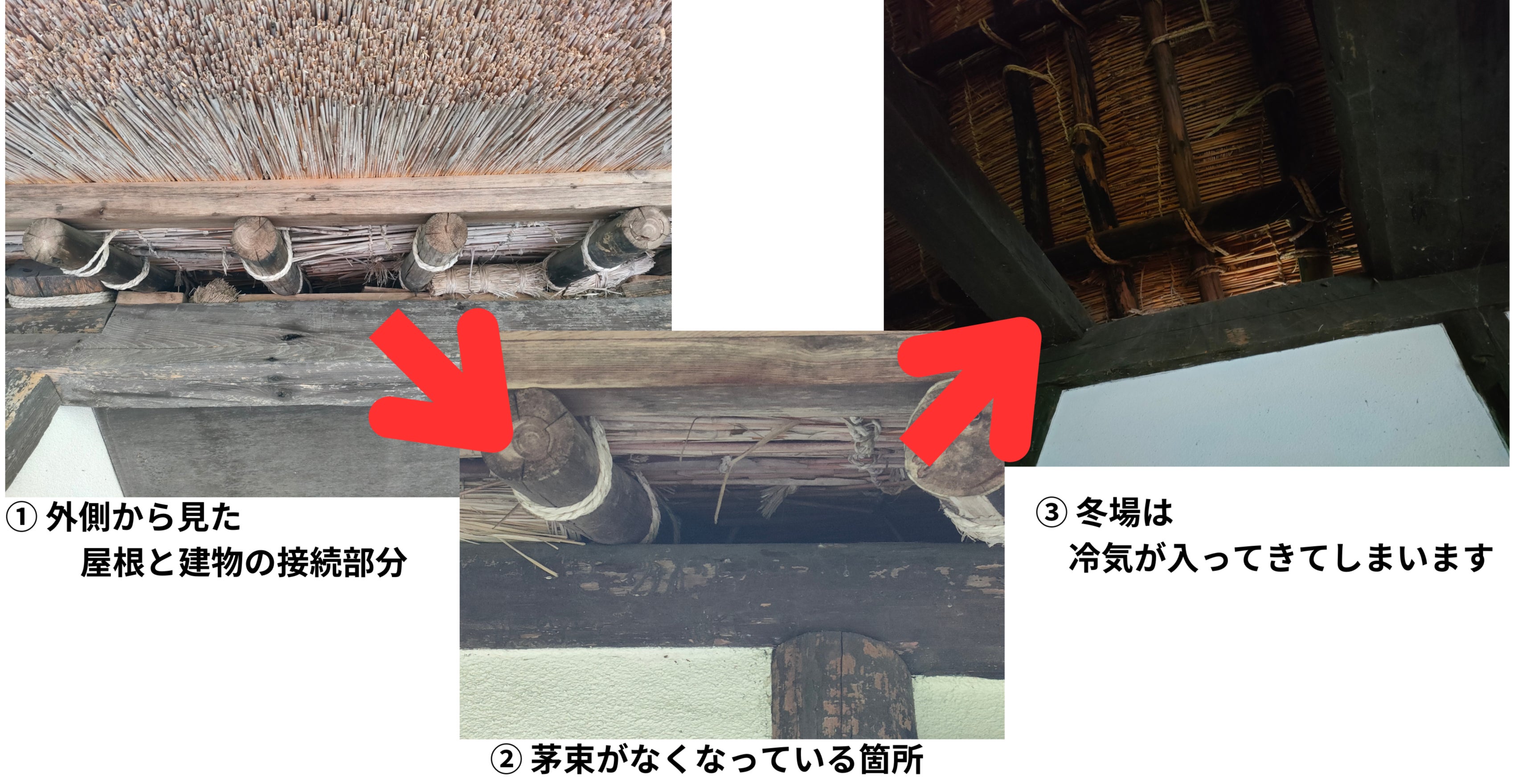 また、屋根と建物(桁)の間のすき間を埋めるために茅や藁の束を入れているのですが、これが経年の風雪によって吹き飛ばれてしまっています。そのため、冬場になると冷気がここから入ってきてしまうため、現在は冬季の利用に適さない状況です。