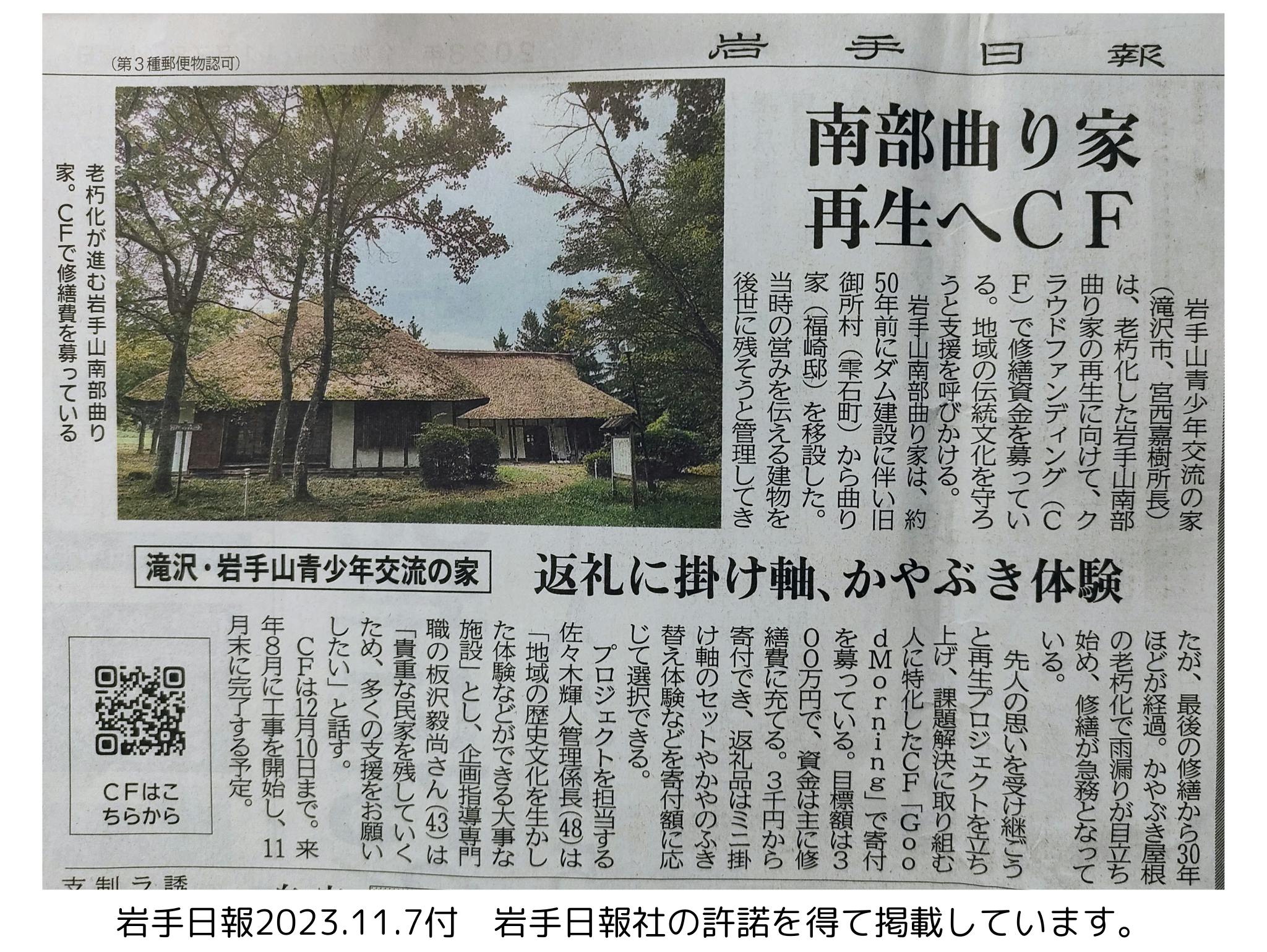 岩手日報(令和5年11/7付)の2面に「曲り家再生プロジェクト」クラウドファンディングを掲載していただきました!